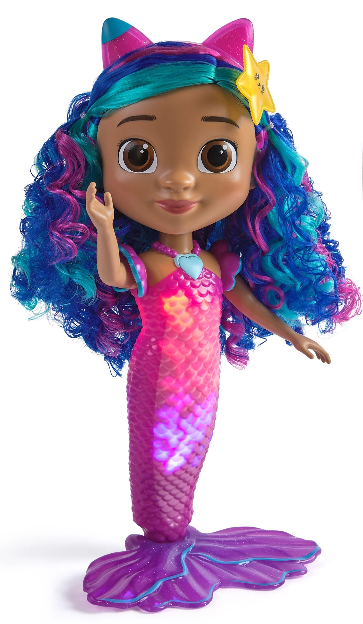 Dukken er vandtæt, så børn kan have det sjovt med den i vandet. Takket være de markante blå‑lilla bølgede lokker, det lyserøde hårbånd med katteører og det stjerneformede tilbehør er den perfekt til kreativ leg, styling og udstilling. Halen med fiskeskæltekstur og bred finne giver en stabil stående position på flade overflader.