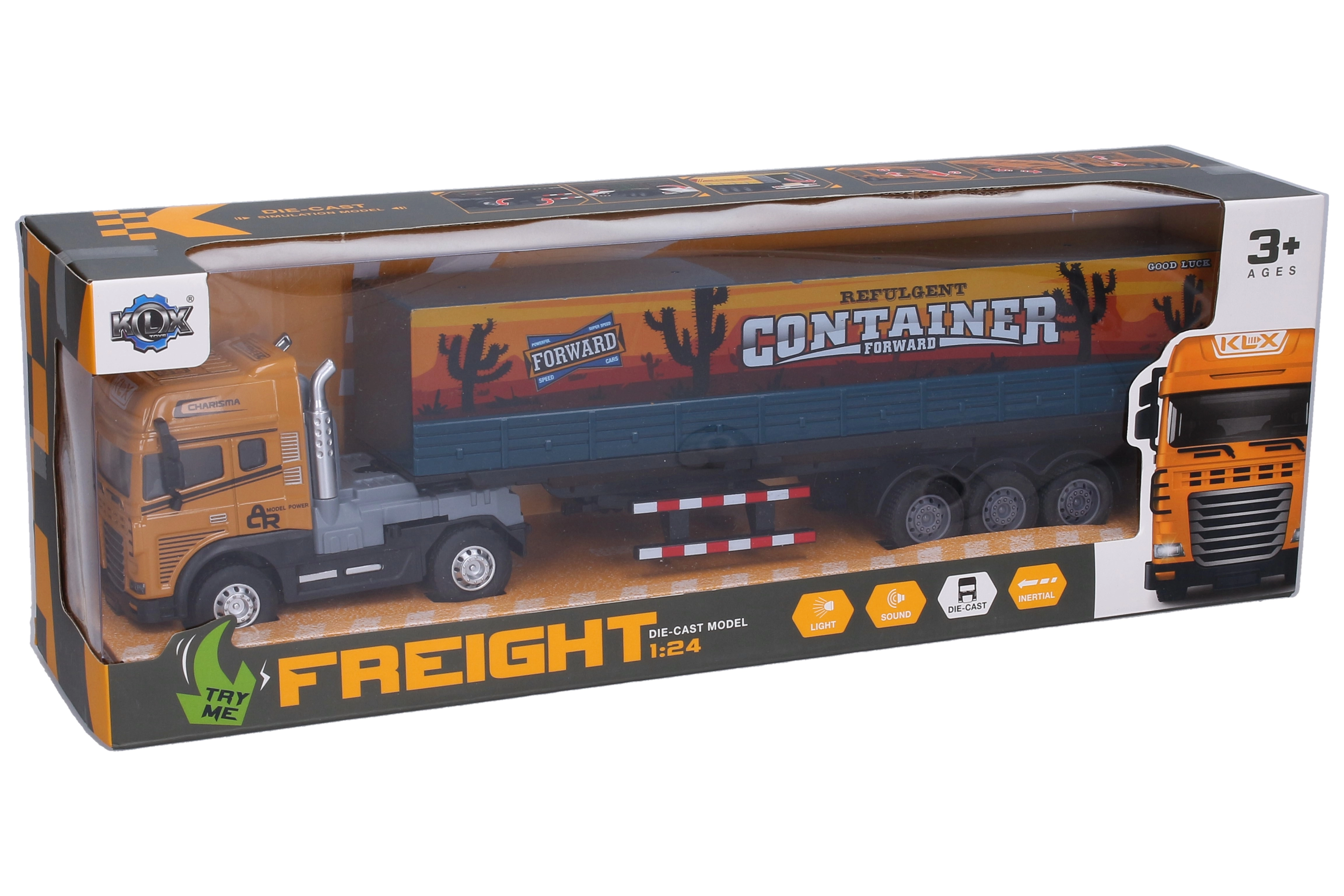 Denne detaljerede metaltrækker med container er ideel til actionfyldt leg og for samlere. Takket være friktionsmotoren er kørslen jævn og sjov, mens lys- og lydeffekterne forstærker den realistiske oplevelse. Effekterne aktiveres nemt ved at bevæge forhjulene.