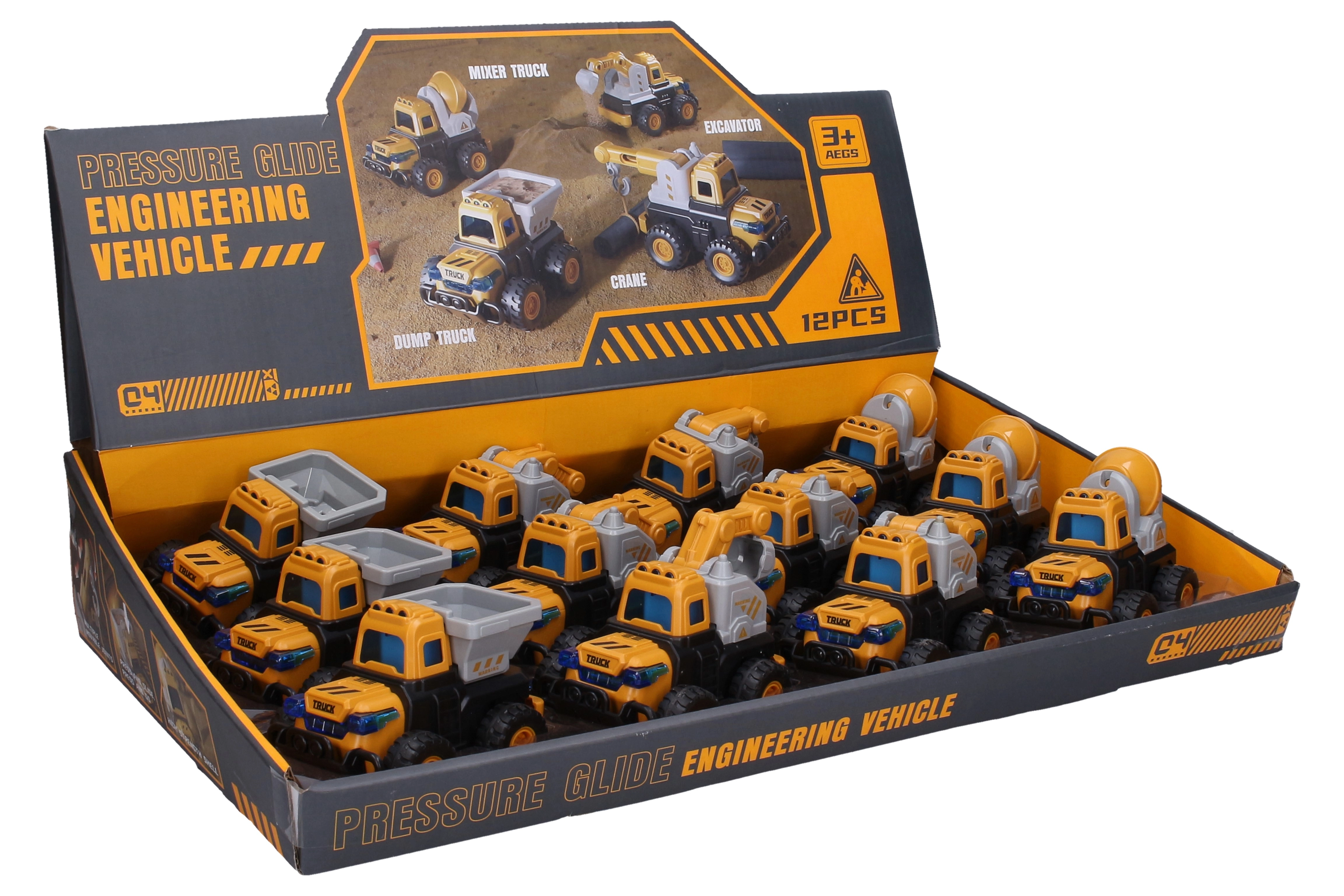 Køretøjerne leveres i en displayboks med 12 stk, ideel til gaver, samling eller indretning af legehjørnet. Holdbare materialer og enkel betjening sikrer sikker og sjov leg hjemme og på farten.