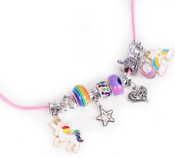 Dette komplette smykkesæt forvandler enhver eftermiddag til et kreativt værksted. Børn trækker nemt pastelfarvede, glitrende og regnbuefarvede perler på og supplerer med charmerende vedhæng – fra små hjerter og stjerner til dyr og kroner. Den enkle skruelukning gør det let at skifte pynt hurtigt og skabe nye kombinationer igen og igen.