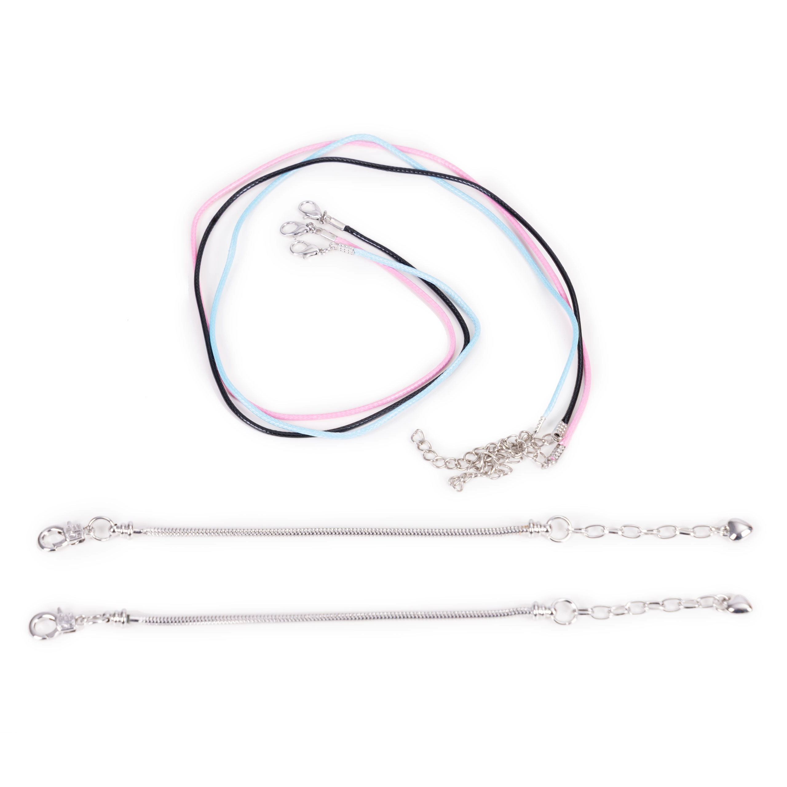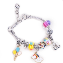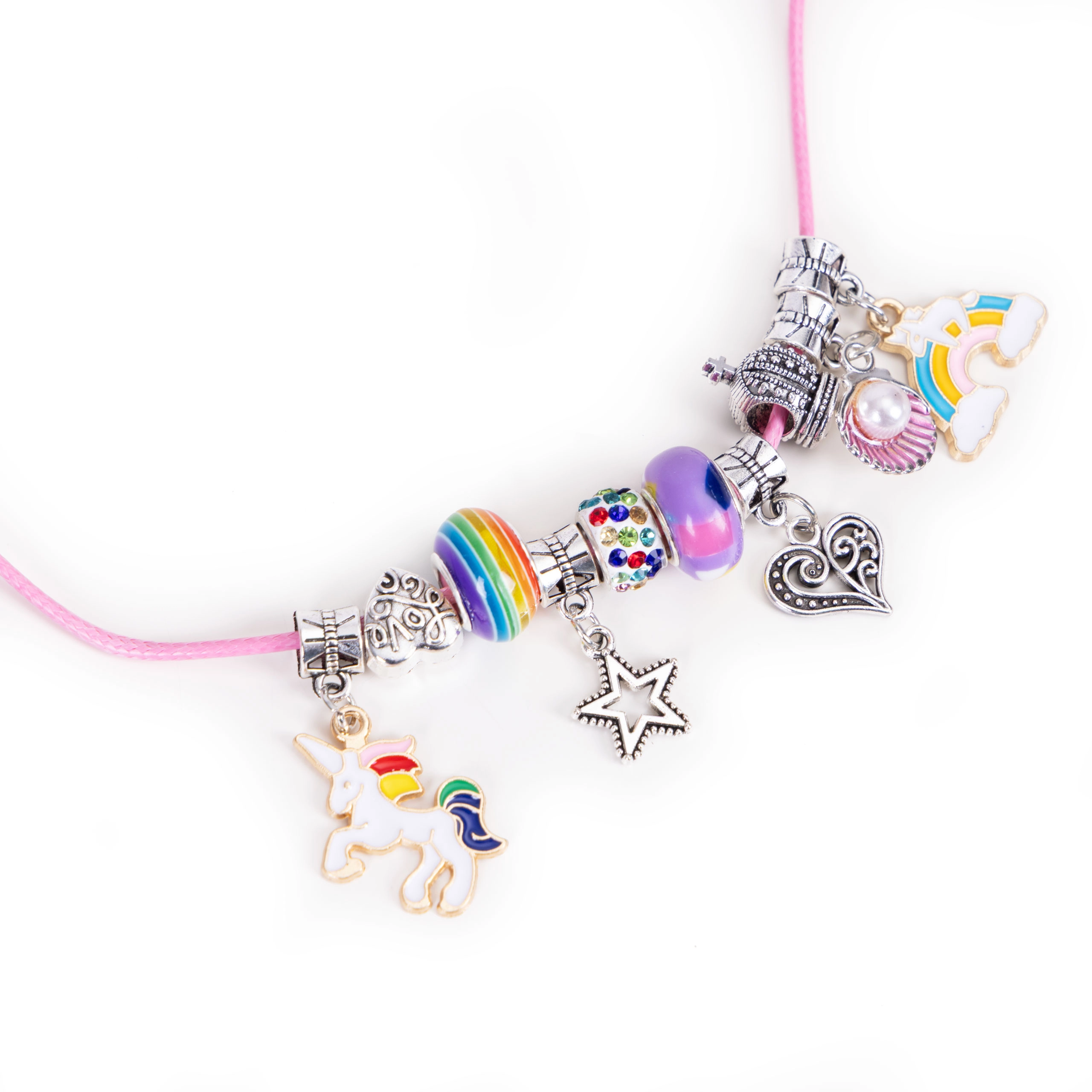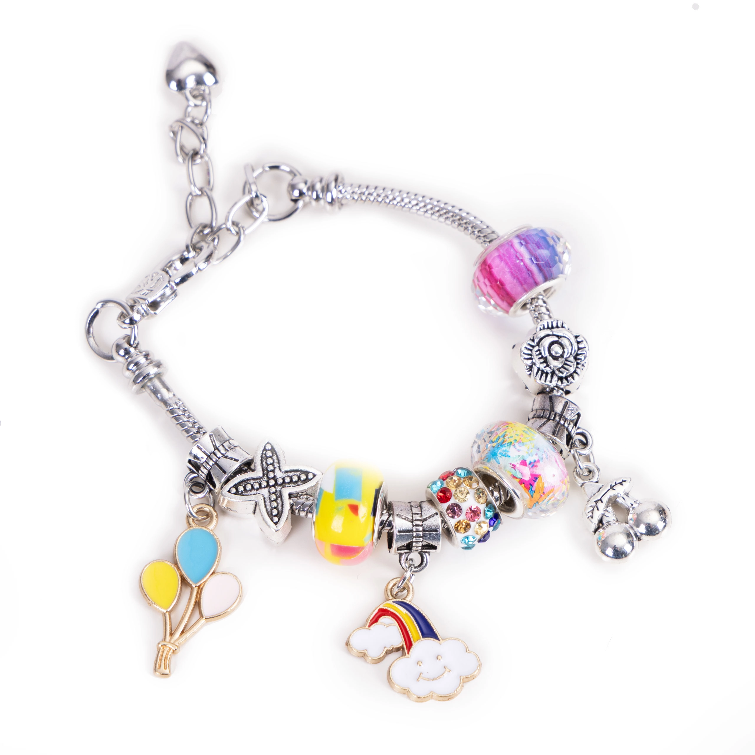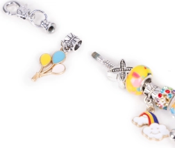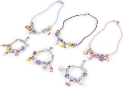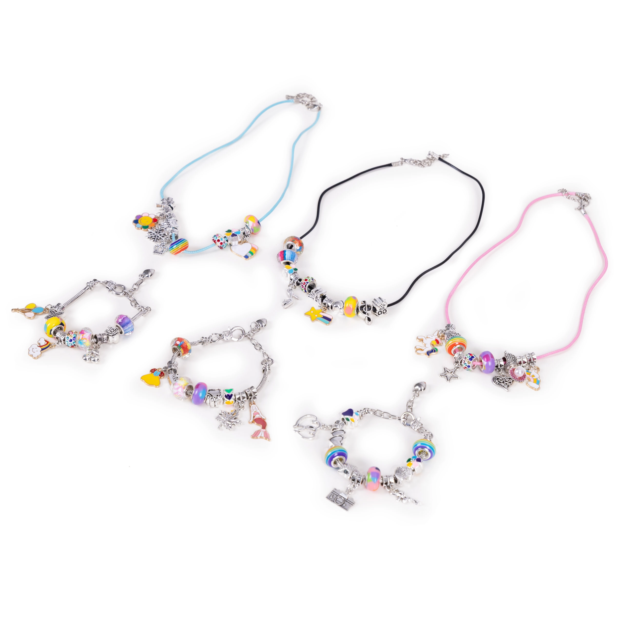 Et mix af pastelfarvede, glitrende og regnbuefarvede perler suppleres af sølvfarvede og emaljerede vedhæng (hjerter, stjerner, dyr, kroner) til uendelige kombinationer.