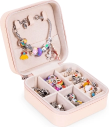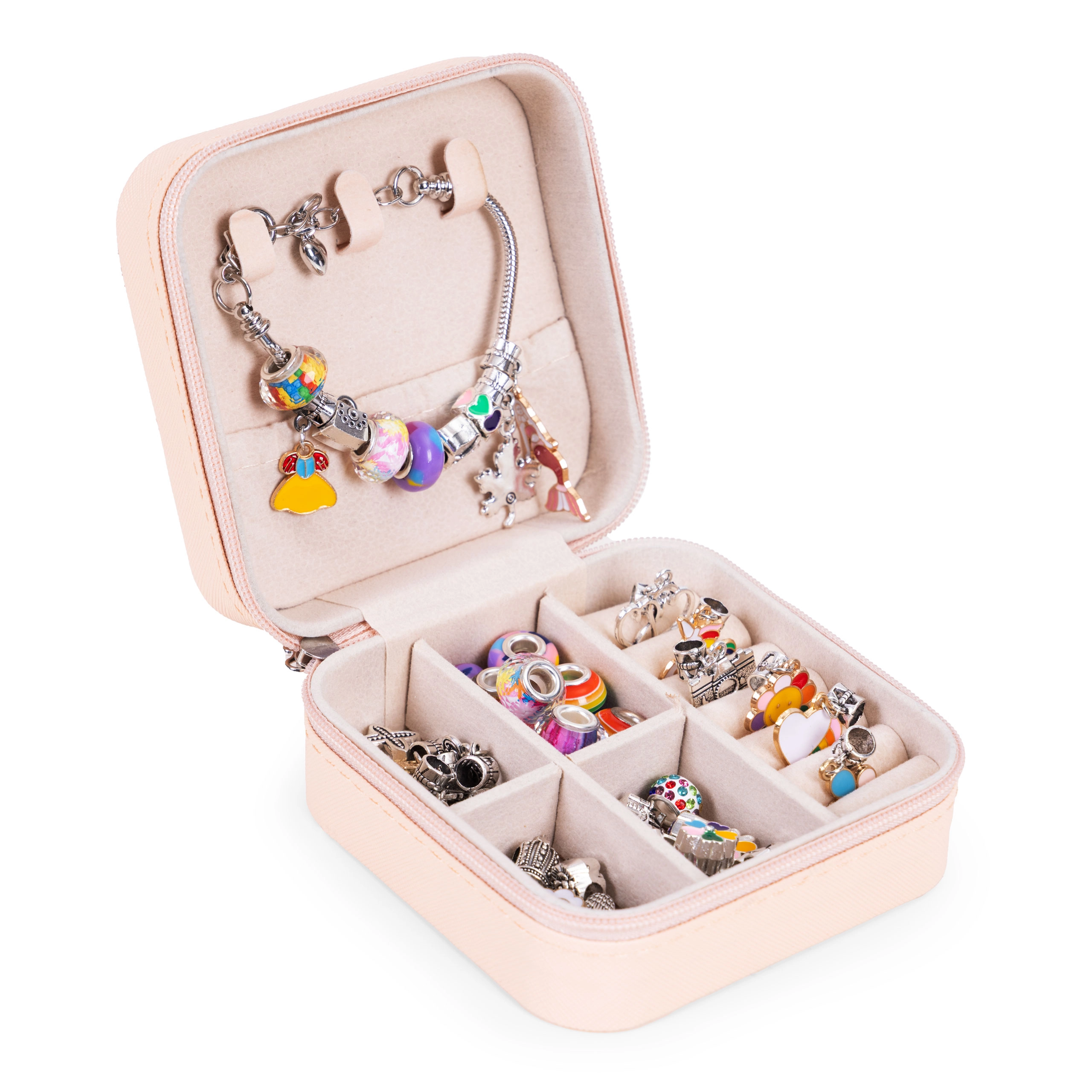En blød, polstret æske med rum og kroge holder perler, vedhæng og færdige armbånd overskueligt samlet ét sted – ideel både hjemme og på farten.