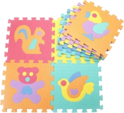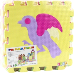 Gulvpuslemåtten i EVA-skum består af 9 store dele (30,5 × 30,5 cm) i levende farver. Udtagelige indlæg i form af dyr (fx fugl, bjørn, hane) giver sjov læring og støtter hånd-øje-koordination. Den teksturerede, skridsikre overflade er behagelig at røre ved, og den bløde skum dæmper fald og støj.