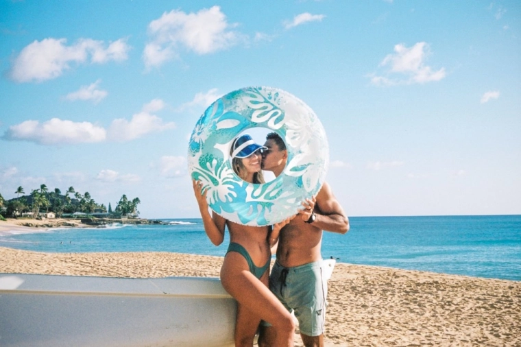 Det markante hawaiianske blomsterprint giver din sommer farver og passer perfekt til både pool og strand.