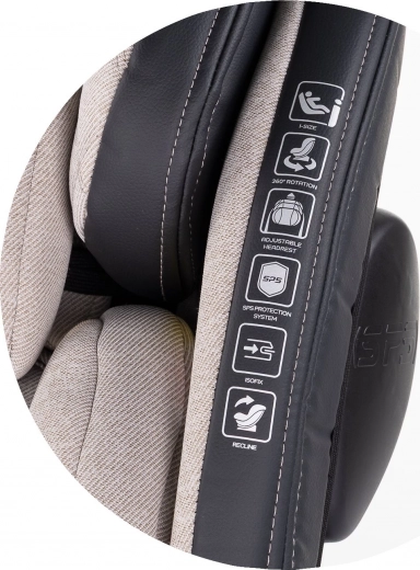 SPS sidebeskyttelse, 5-punktssele, 11 positioner på nakkestøtten, 4 sædehældninger og en 3D-pude til trykaflastning sikrer sikkerhed og komfort fra spæd til skolebarn.