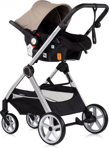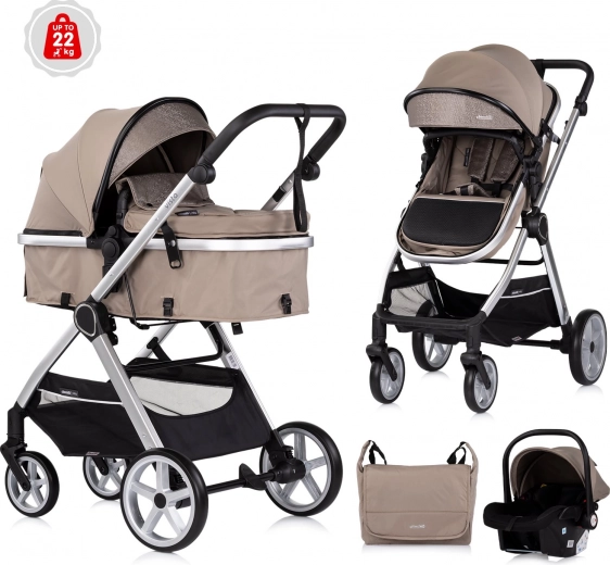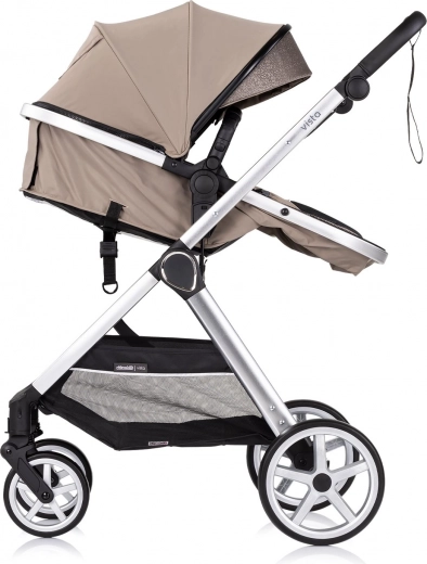 Stilfuld og praktisk barnevogn 2-i-1 CHIPOLINO VISTA i nuancen Tiramisu kombinerer liggedel og klapvognssæde i én. Den byder på en let aluminiumsramme med affjedring på alle hjul, vendbart sæde med og mod kørselsretningen, justerbar kaleche og rumlig kurv. For sikkerheden er der 5-punktssele, forbundet bremse og sikkerhedsstrop på håndtaget.