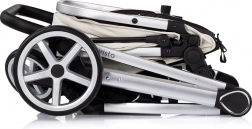 Den lette aluminiumsramme med eloxeret finish og affjedrede hjul giver en jævn kørsel i byen og i parken. Sikkerheden sikres af en 5-punktssele med blød polstring og en aftagelig bøjle i økolæder. Den praktiske kaleche med aftagelig solskærm og ventilationsvindue beskytter i al slags vejr, mens den store kurv og den medfølgende pusletaske rummer alt det nødvendige.