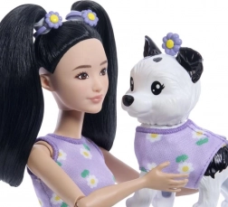 Dette charmerende BARBIE-sæt med hund tilbyder den perfekte kombination af mode og fantasi. Dukken i et lavendelfarvet blomsteroutfit og hendes kæledyr i en matchende vest er klar til hverdagens eventyr. Med det rige udvalg af tilbehør kan børn skabe nye historier og udvikle deres fantasi.