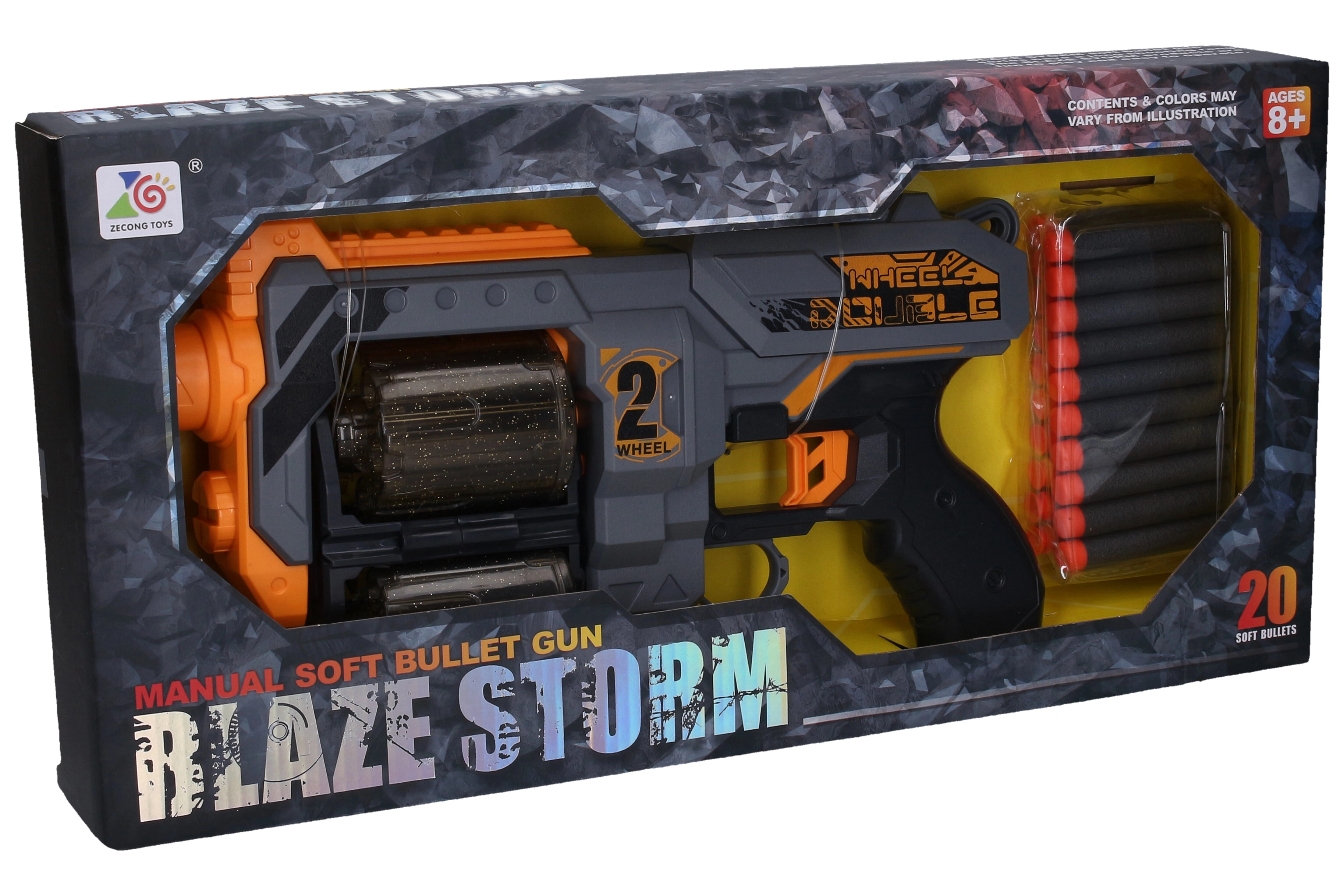 Sjov og sikker actionpistol Wheel Double til børn, der giver dynamisk skydning med skumprojektiler. Sættet indeholder i alt 20 projektiler, inklusive varianter med sugekop til målrettet leg. Takket være enkel betjening er den ideel til både indendørs og udendørs underholdning. Våbnets mål er 32,5 × 19 × 6,3 cm, og der medfølger billedvejledning. Sikker skummunition, nem betjening og spilleklart sæt gør den til et godt valg for små actionentusiaster.