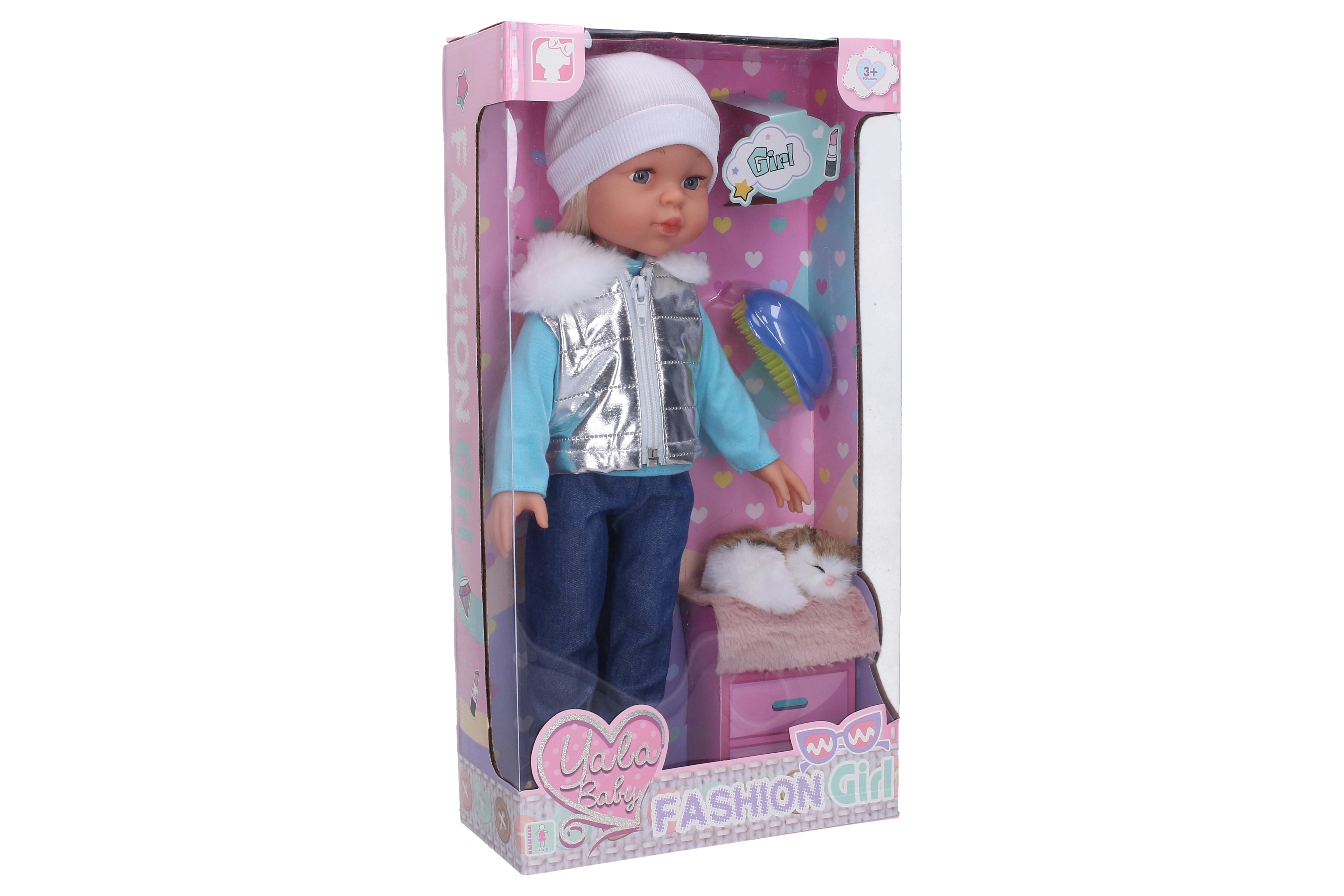 Denne dukke er ideel til daglig leg og udvikling af fantasien. Takket være størrelsen 43 cm ligger den godt i hånden og er let at håndtere. I pakken findes også en sød kat og en børste til at rede dukkens hår.