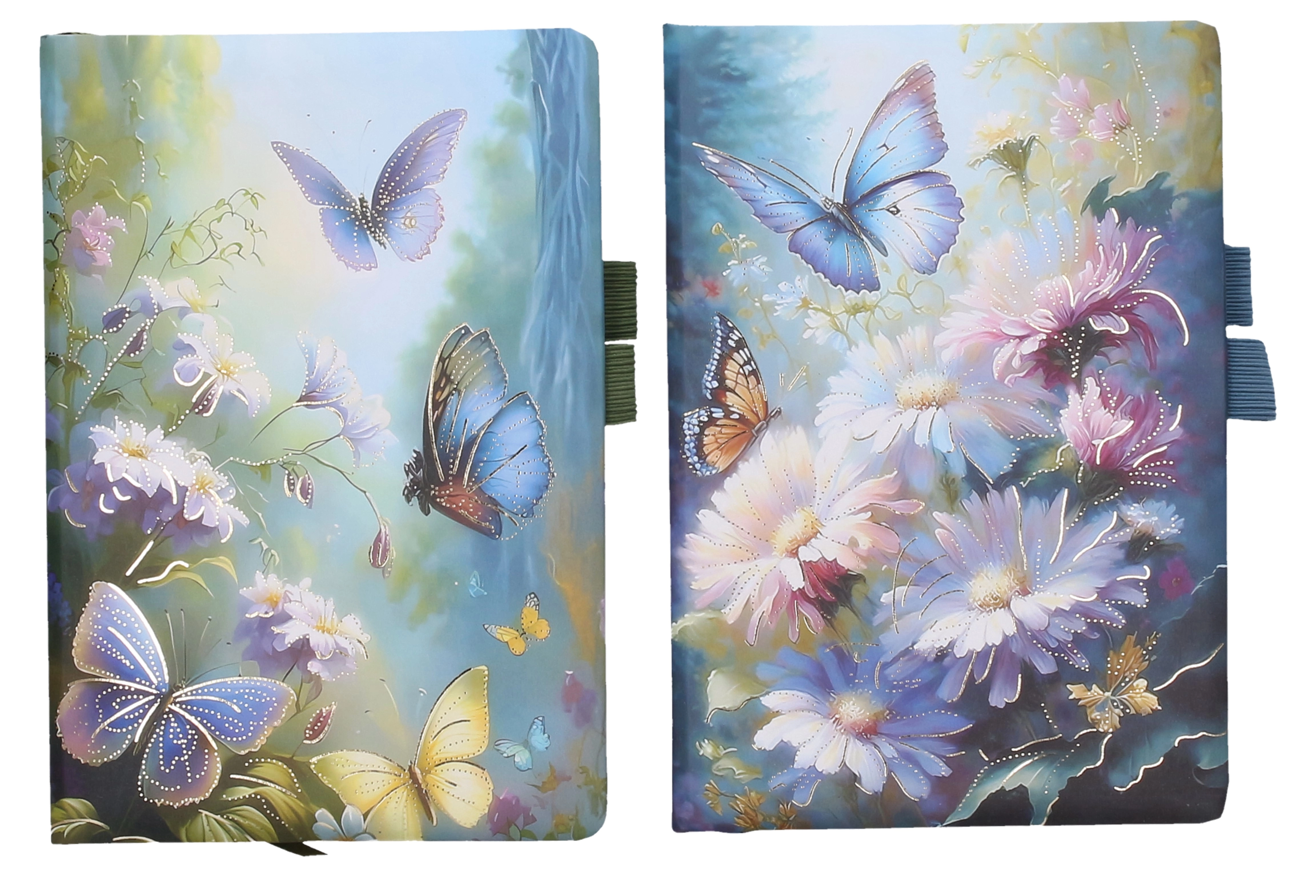 Opdag en elegant notesbog med sommerfugle, ideel til skole, arbejde og rejser. Takket være formatet 14 × 21 cm er den rummelig nok til overskuelige noter og passer samtidig i en større håndtaske eller rygsæk. Den linjerede inderside sikrer behagelig skrivning og god organisering.