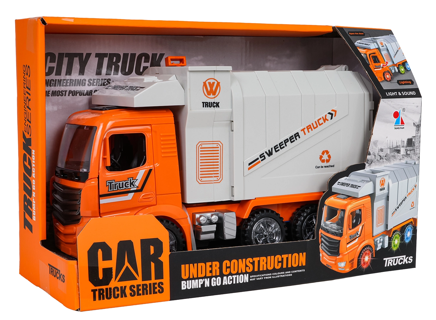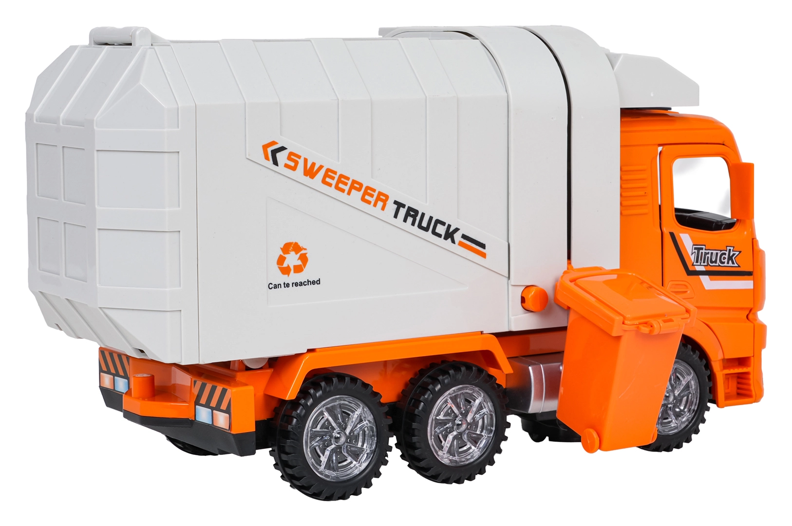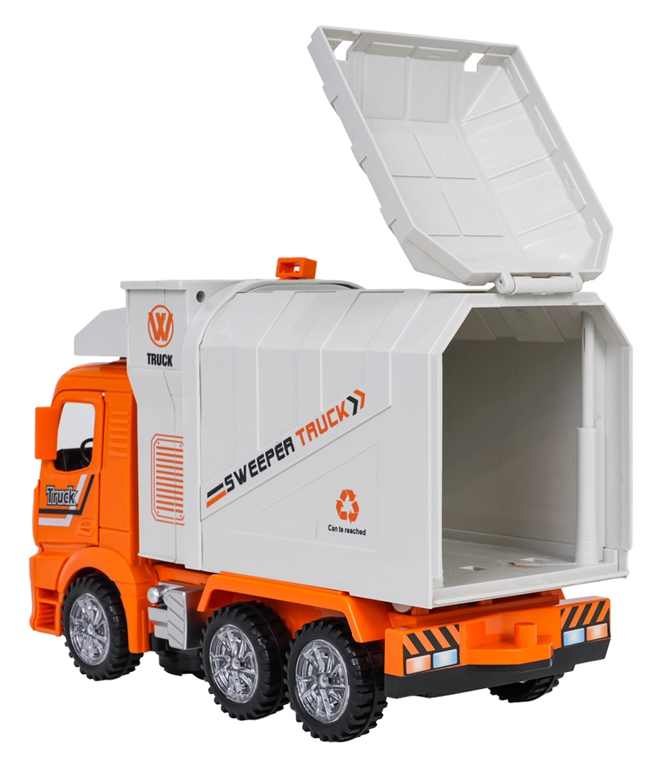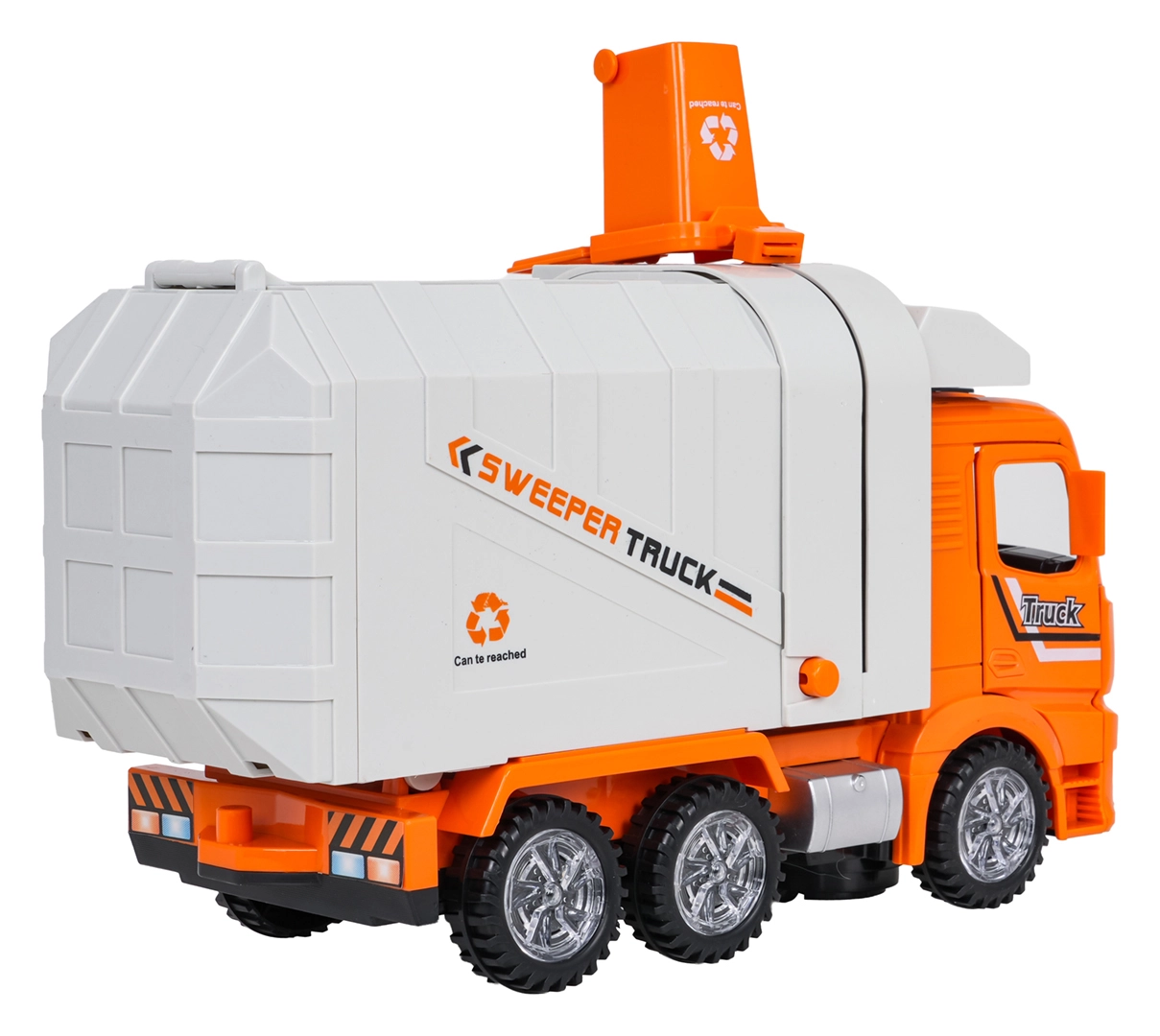 Ud over de elektroniske funktioner tilbyder bilen også manuelle muligheder – du kan åbne bagklappen og tippe skraldespanden direkte ned i trakten. Den robuste konstruktion og de lysende elementer sikrer mange timers sikker underholdning for små chauffører fra 3 år.