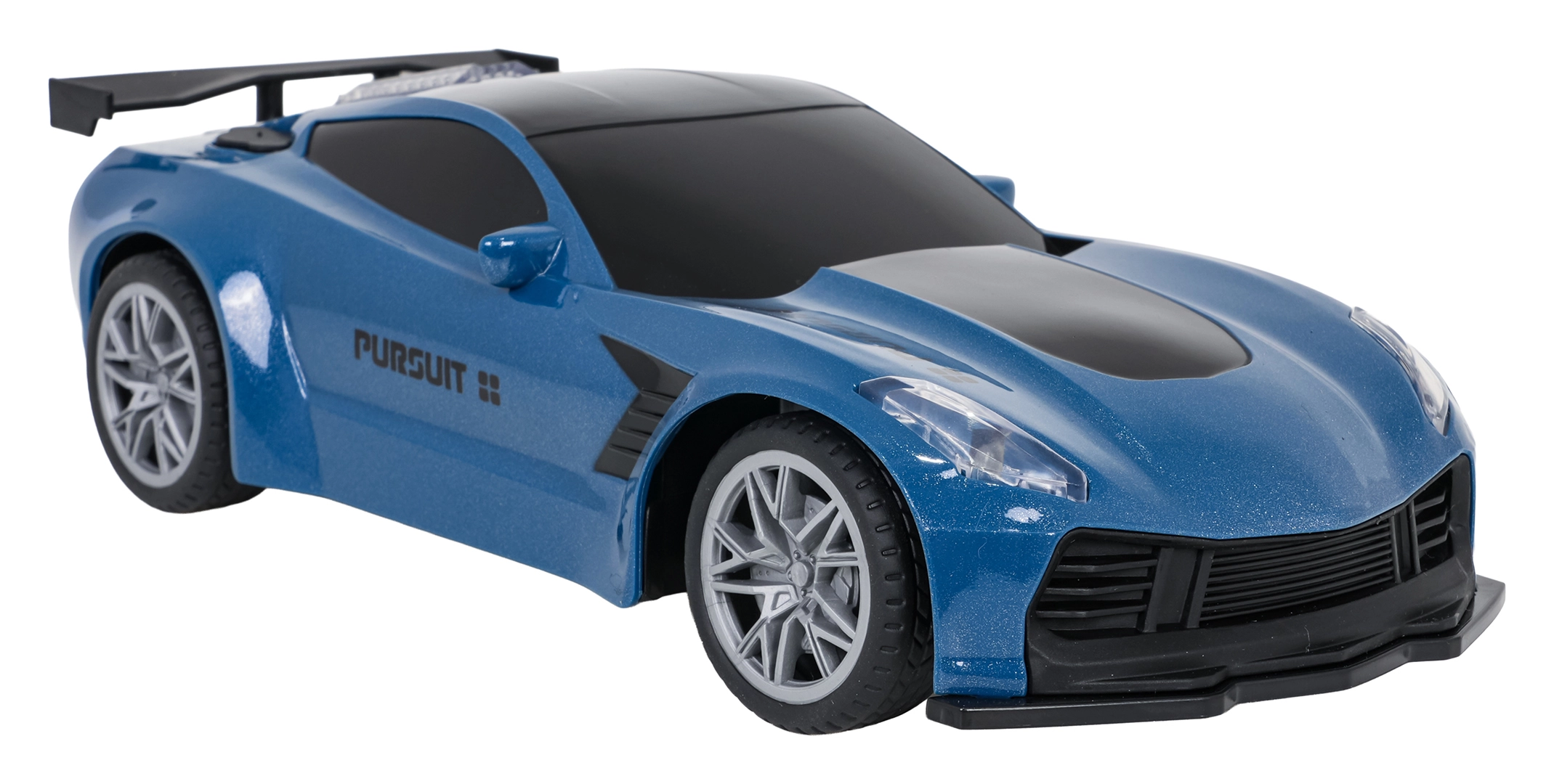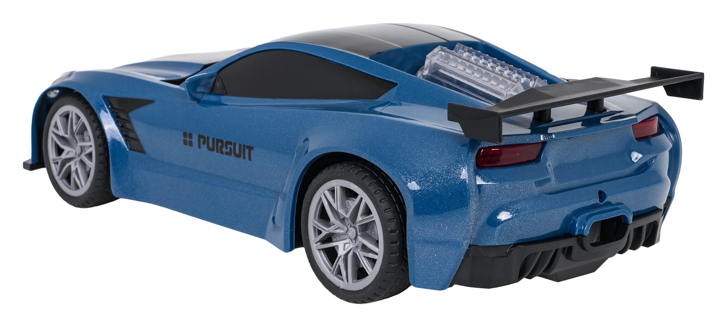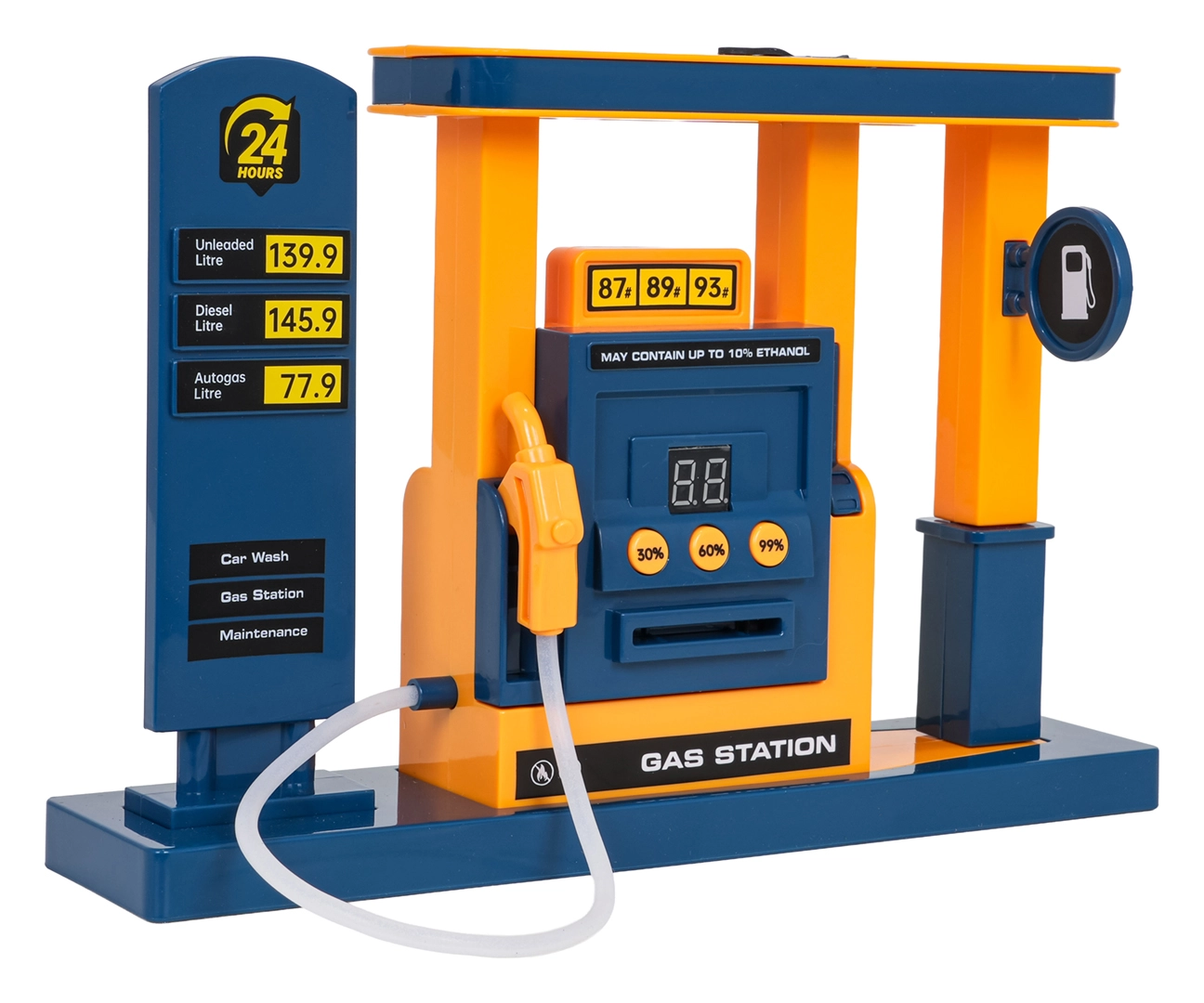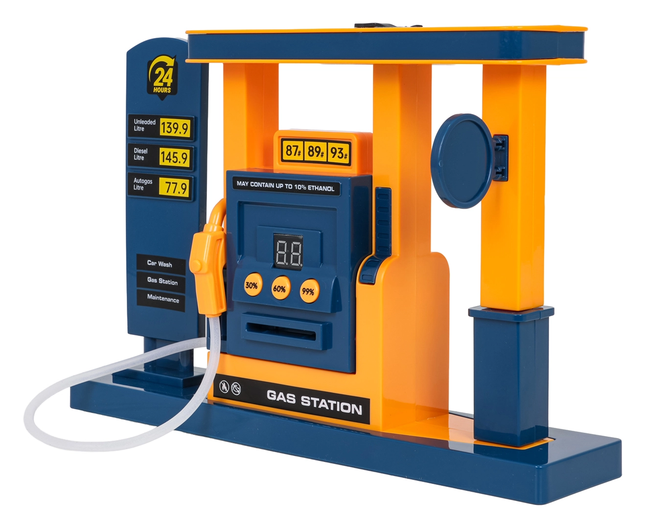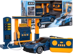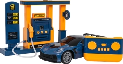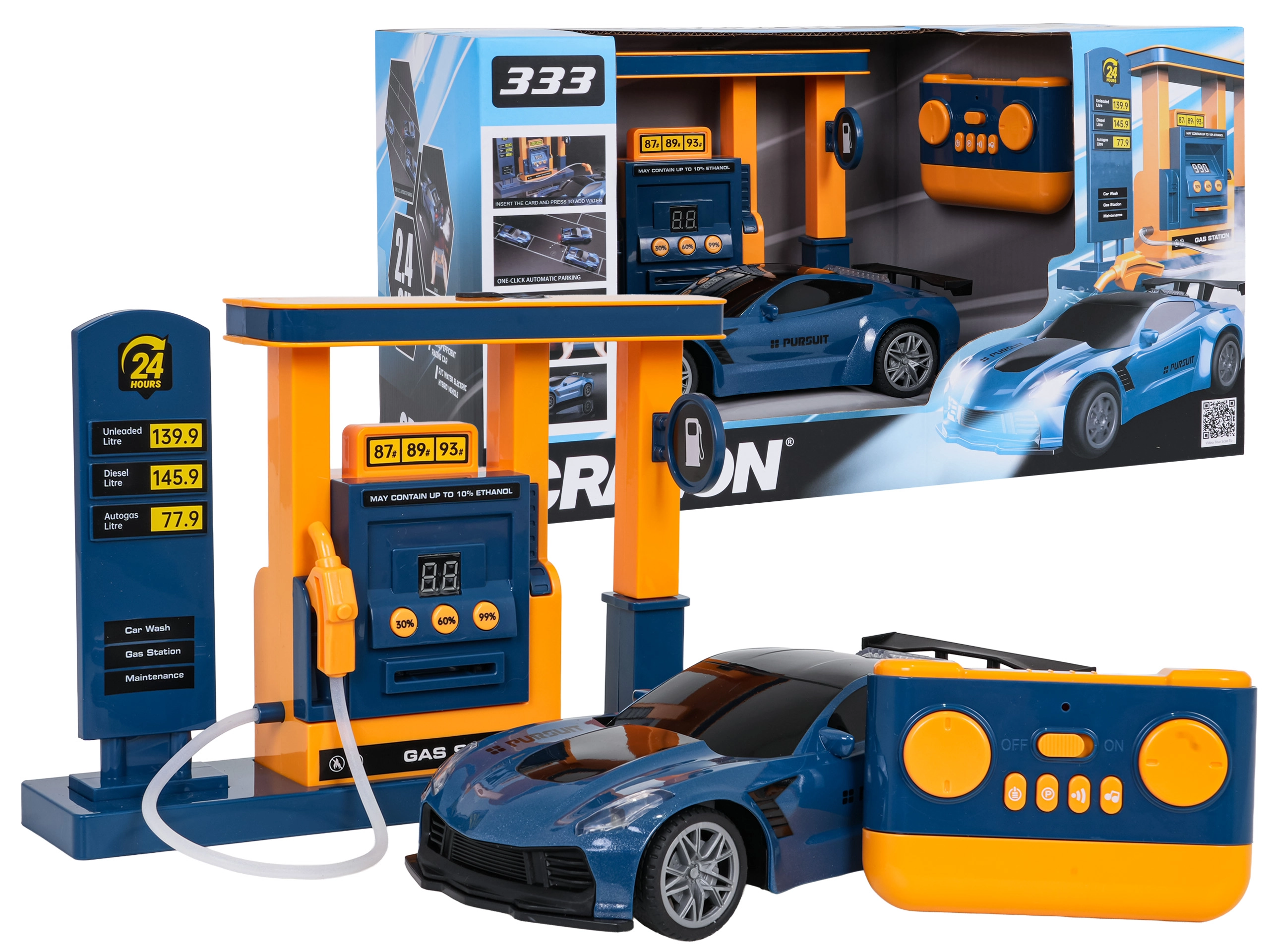Bilen styres på 2,4 GHz – uden forstyrrelser, jævnt og i alle retninger: frem, tilbage, højre og venstre. Den har for- og baglygter, robust karrosseri, gummidæk med godt vejgreb og retningsjustering. Tankstationen byder på lys- og lydeffekter ved tankning samt indikator for “brændstofniveau”. For bekvem leg kan man slå lydene fra og bruge automatisk parkering fra controlleren.