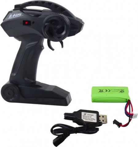 Det moderne 2,4 GHz-radiosystem giver jævn kontrol selv ved kørsel med flere RC-modeller samtidig. Den ergonomiske pistolcontroller ligger godt i hånden og muliggør præcis dosering af gas og styring.