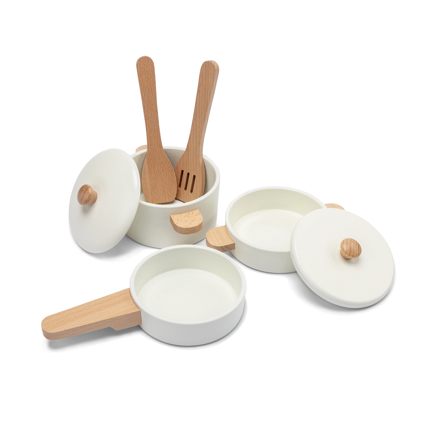 Dette elegante sæt af træ-køkkengrej til børn i hvid er et perfekt supplement til ethvert børnekøkken. Det indeholder en gryde med låg, pander og træredskaber – alt med glat overflade og behagelige, naturligt tonede håndtag for et sikkert greb til små hænder.
