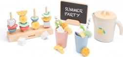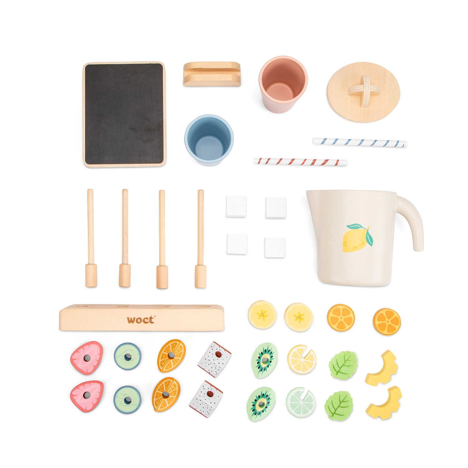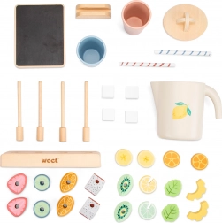Dette glade træsæt indeholder alt, hvad børn behøver for at lave lemonade og frugtige lækkerier. Fyld blot koppen, tilføj frugtskiver, pynt med sugerør, og serveringen kan begynde. Børn kan blande forskellige kombinationer, finde på egne opskrifter og udvikle fantasien, når de leger picnic eller bod med forfriskninger.