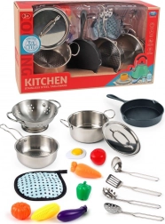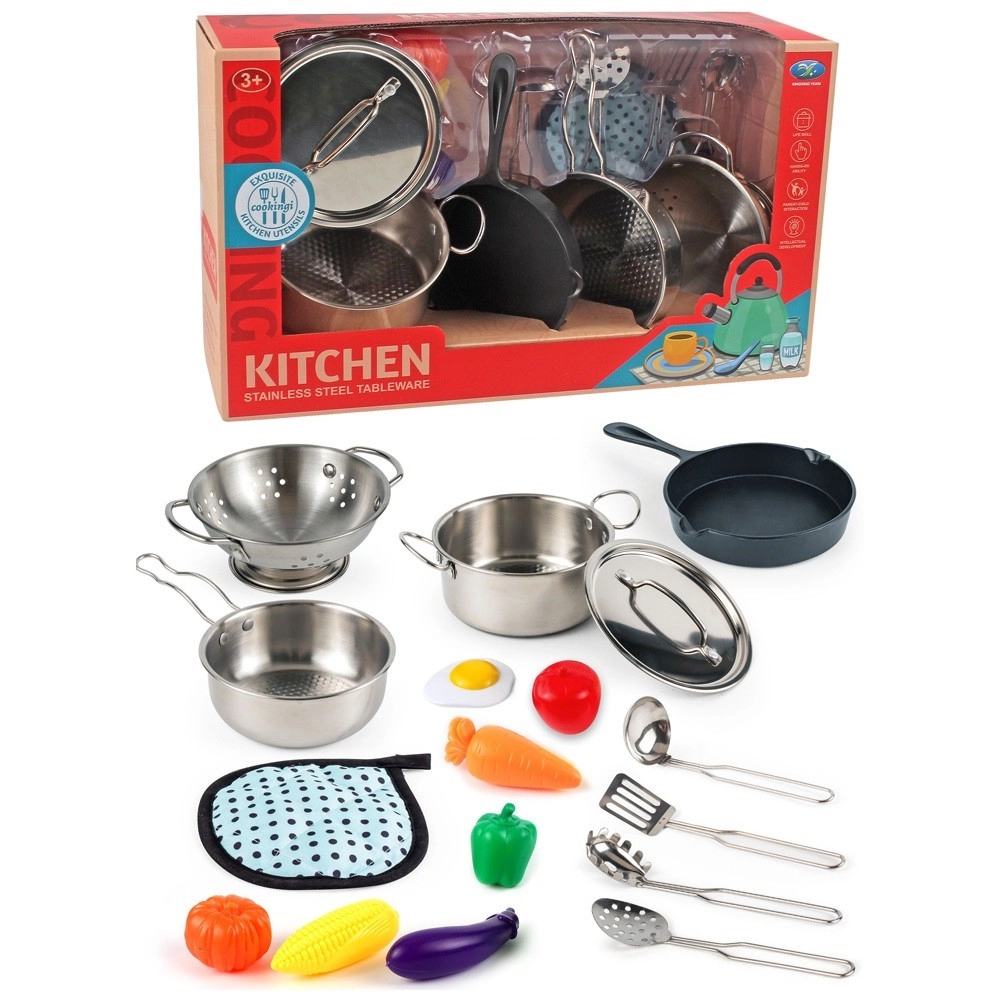 Dette omfattende sæt giver børn en autentisk madlavningsoplevelse. Metalkøkkengrejet er robust, ligger godt i hånden og suppleres af realistiske tilbehør – inklusive plastgrøntsager og et praktisk tekstilunderlag. Ideelt til legekøkkener og fælles leg med forældre eller venner.