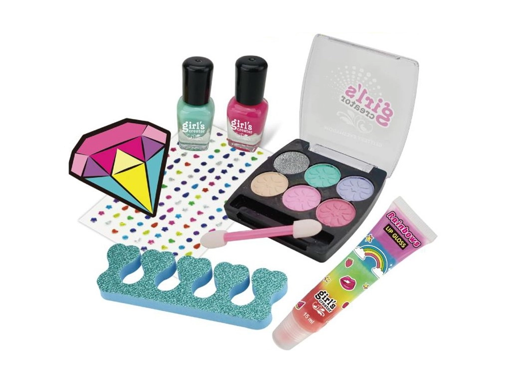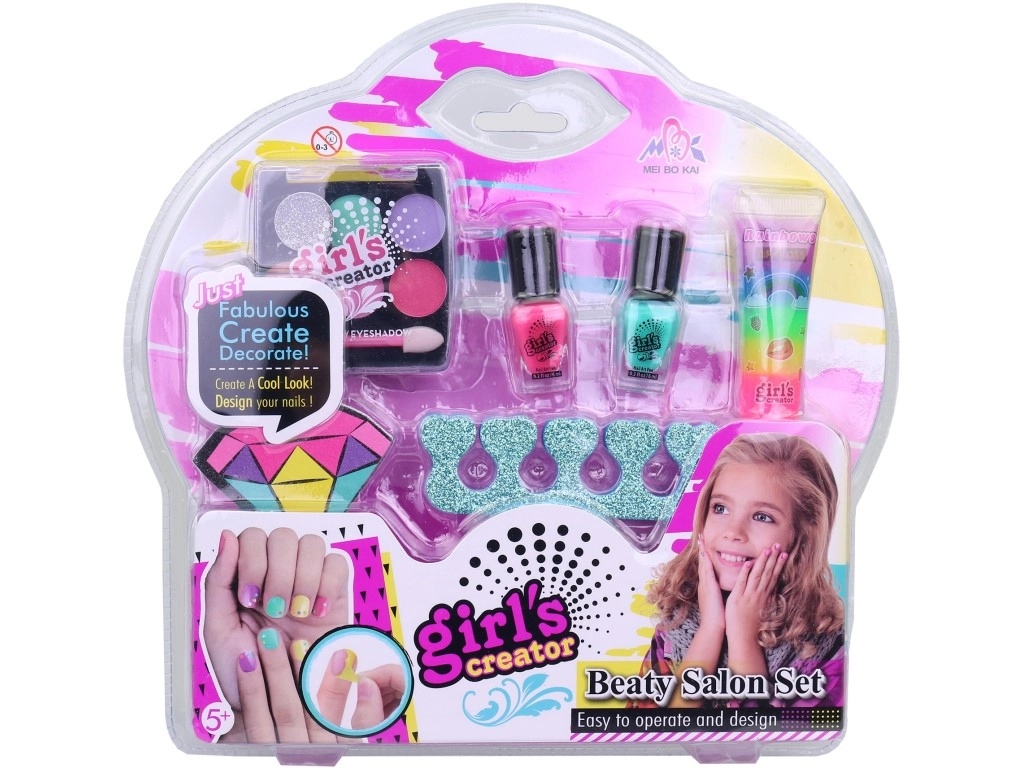 - Komplet udstyr: 2 farverige neglelakker, negleklistermærker, fingerstøtte, ansigtsmalesæt, læbeglans.