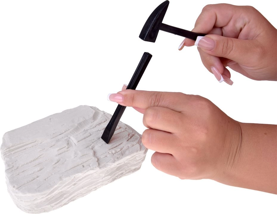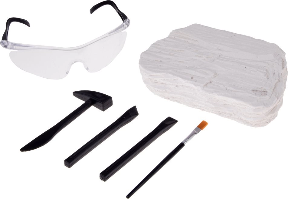 Der medfølger en robust gipsblok og beskyttelsesbriller, som beskytter øjnene under afdækningen af fossilet. Ideelt til sikker arkæologi derhjemme.