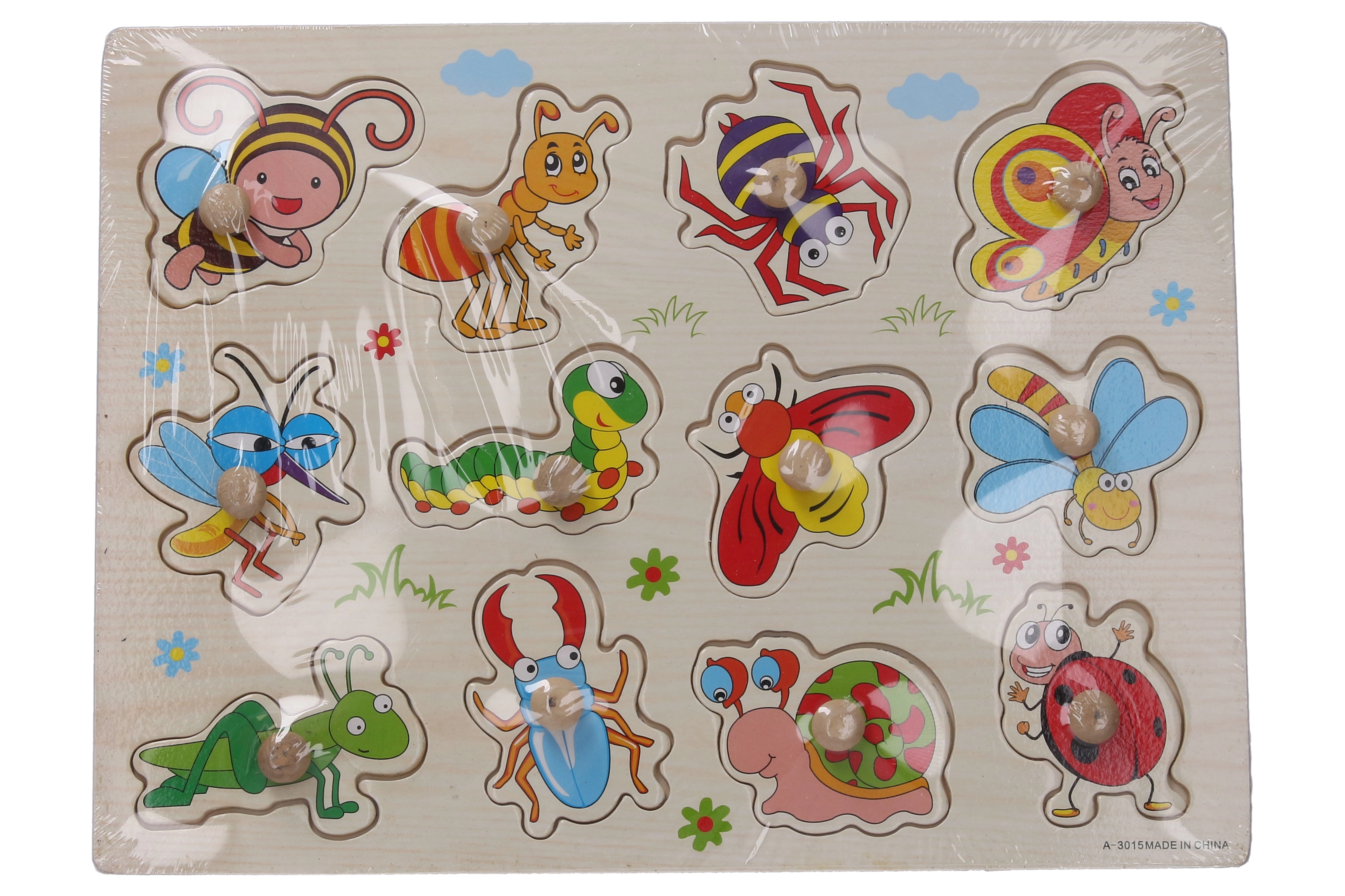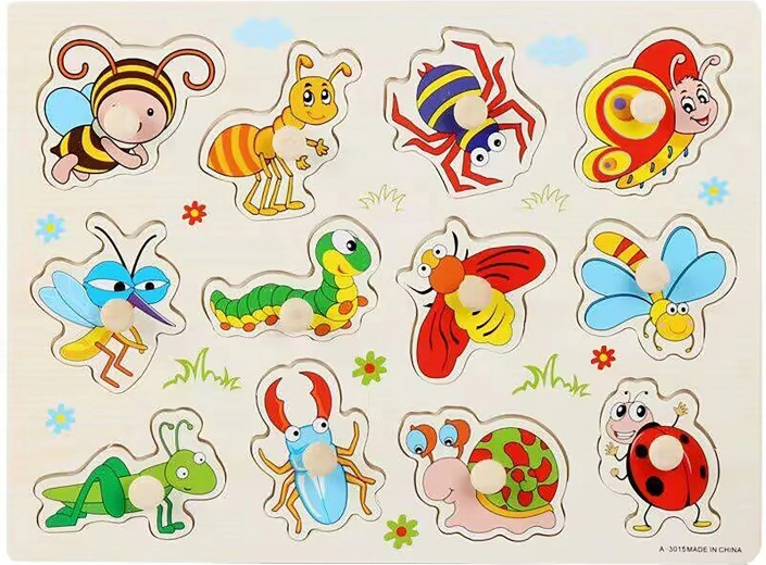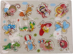 Opdag et sjovt og lærerigt legetøj til de mindste: træindsætningspuslespil med insektmotiv i størrelsen 30 × 22,5 × 1 cm. Hjælper med at udvikle finmotorik, logik og genkendelse af former og dyr.