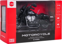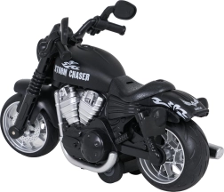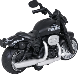 Realistisk metalmotorcykel i skala 1:16, der vil glæde små motorcyklister fra 3 år. Den har metalkarosseri, gummidæk med god vejgreb og pull-back (tilbagetræk). Når det bagerste hjul trykkes ned, aktiveres lyseffekter og startlyd. Batterier 3× AG3 er inkluderet i pakken.
