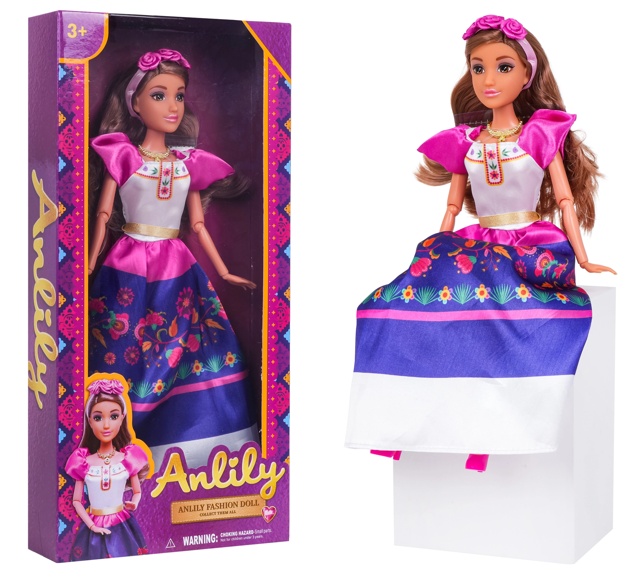 Modellen er fremstillet med fokus på detaljer og holdbarhed, så den kan klare daglig leg. Det lange brune hår kan redes og sættes i forskellige frisurer, hvilket understøtter finmotorik og kreativitet hos børn.
