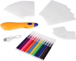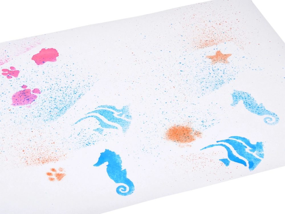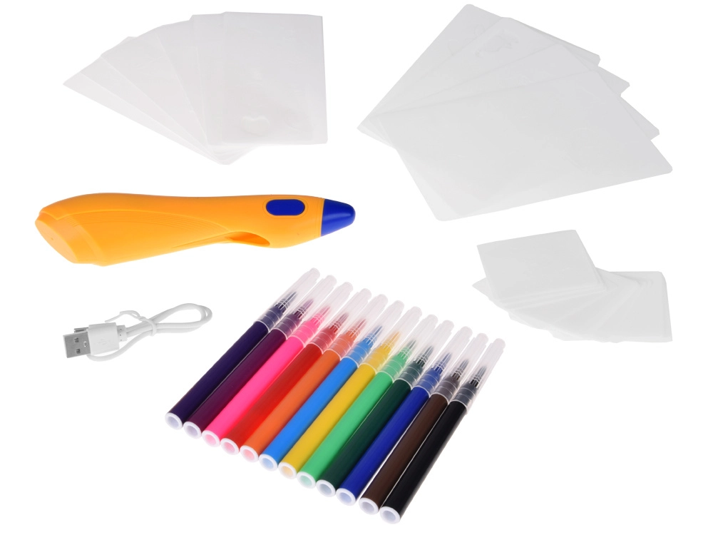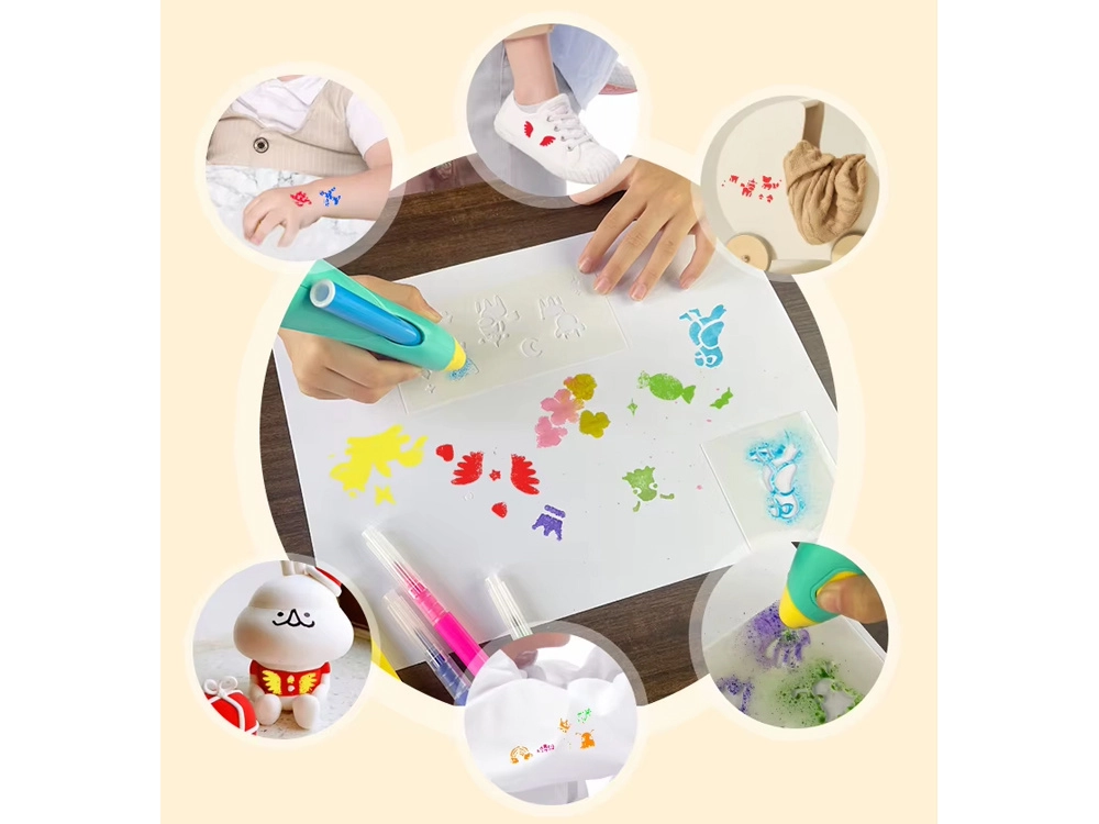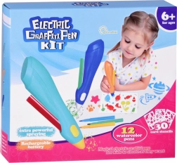 Pakken indeholder skabeloner med mange motiver, 12 farvede tuscher og et USB-kabel til nem opladning. Børnene træner fantasi, farvesans og tålmodighed – uden sprayrod og uden lugt.