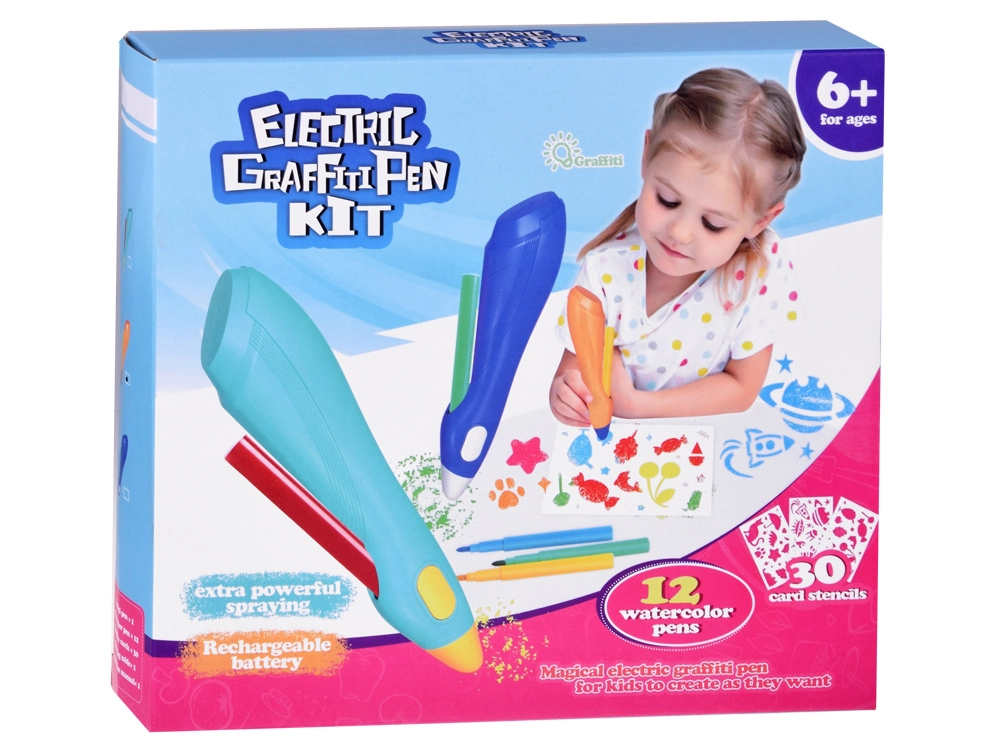 Opdag en sjov måde at inspirere børn til at skabe på: den elektriske graffiti-pen fungerer som en kompakt airbrush. Takket være en kraftig, men sikker luftstrøm forstøver den farven fra tuschen til fine prikker og overgange. Resultatet? Stilfulde bogstaver, billeder og dekorationer med autentisk “street art”-look.