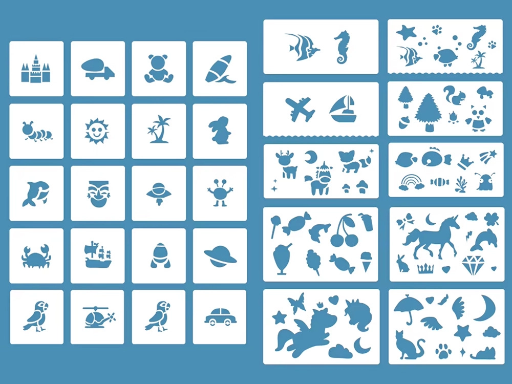 Aftagelige plastskabeloner skylles let i vand og kan bruges igen og igen – fra dyr til stjerner og mange flere mønstre.
