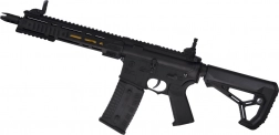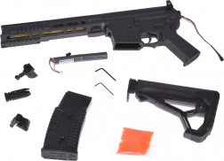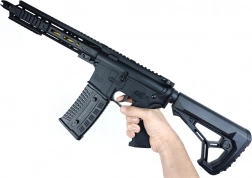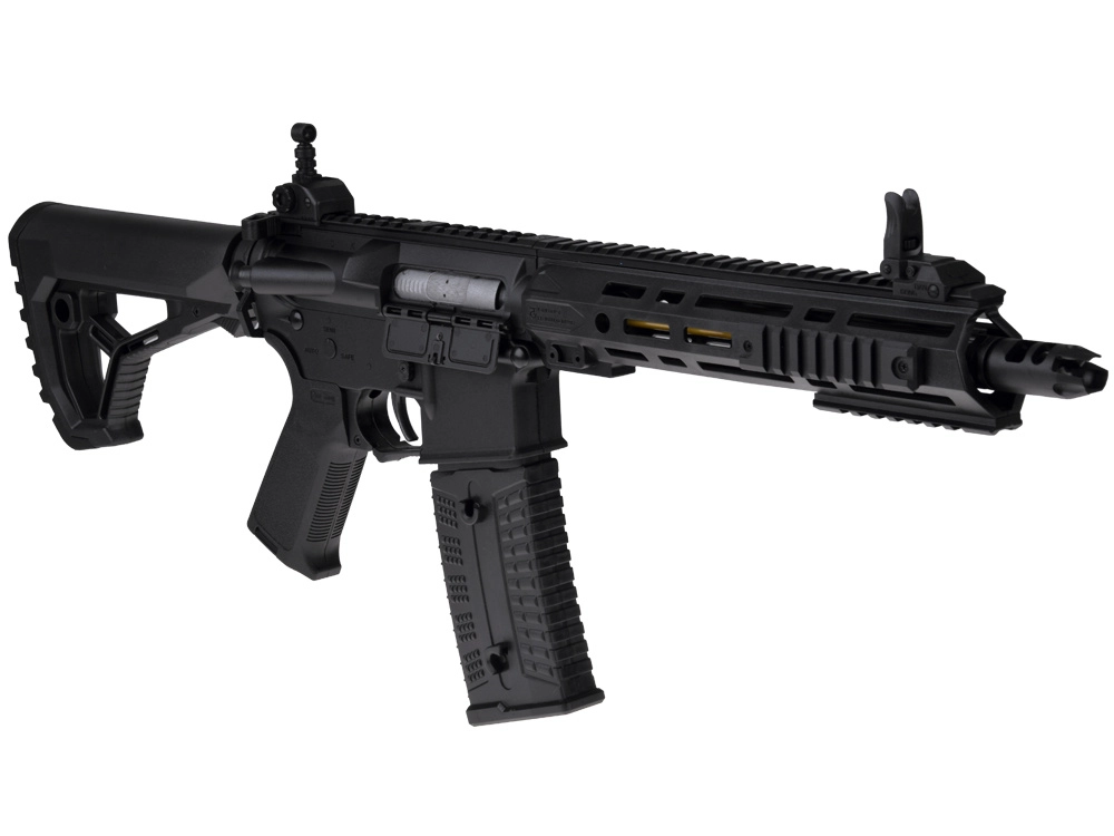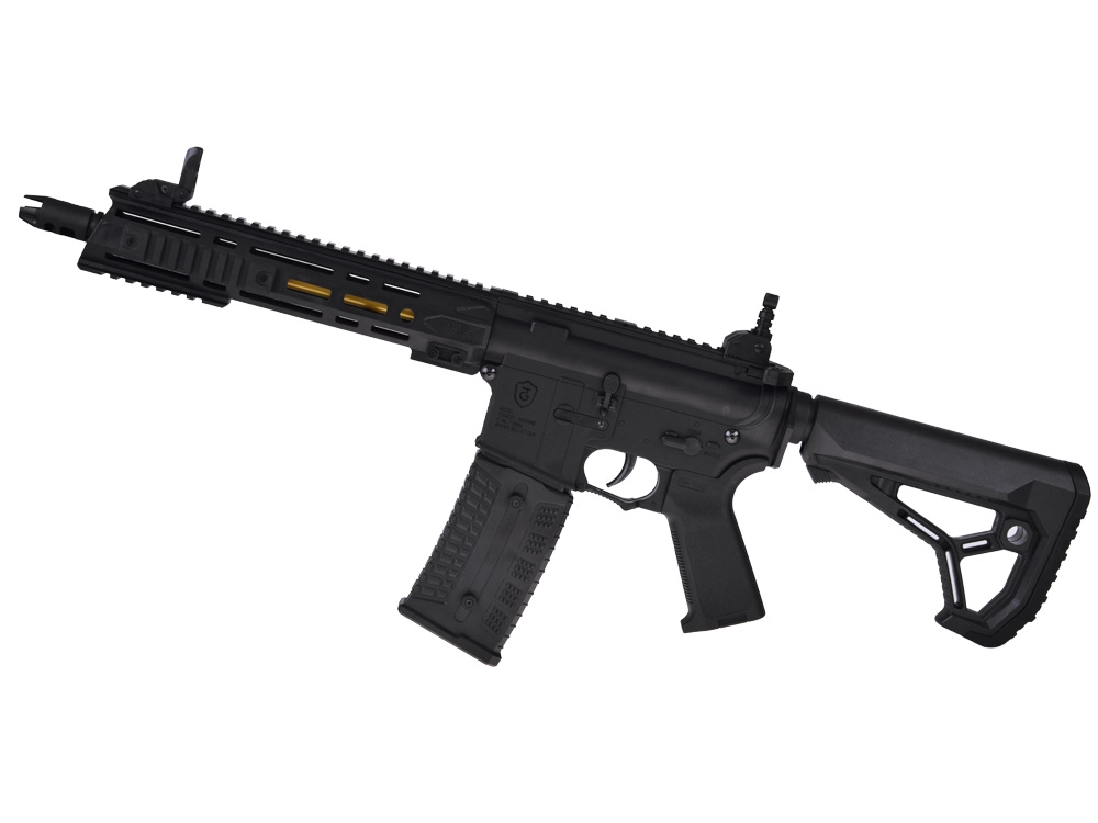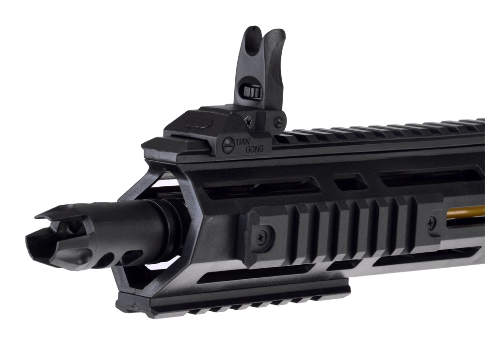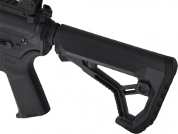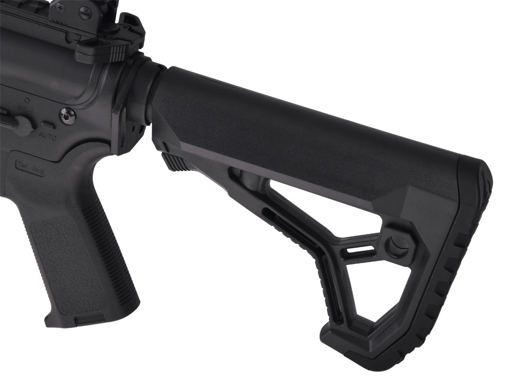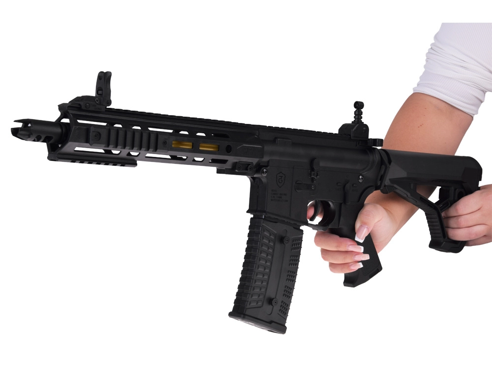 Langt forskæfte med monteringsskinner, sammenklappelige sigter og justerbar kolbe forstærker spiloplevelsen og forbedrer grebets ergonomi.