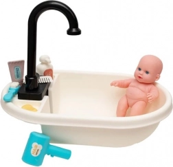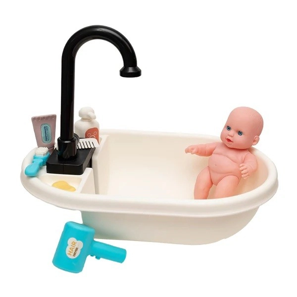 Pakken indeholder badekar med bruser, dukke og praktisk tilbehør: mini føntørrer, flaske med shampoo, sæbe, kam, tandbørste og en tube tandpasta. Pastelfarver og omhyggelig udførelse sikrer et attraktivt udseende og lang holdbarhed.