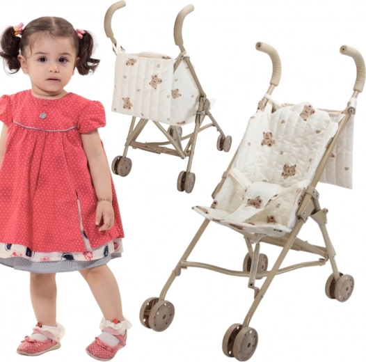 Denne stilfulde dukkevogn kombinerer komfort, sikkerhed og praktisk sammenklappelighed. Doble hjul giver en jævn kørsel, mens den robuste men lette konstruktion foldes til kompakt størrelse på ingen tid. Det cremefarvede sæde med et sødt bamsemotiv giver legen ekstra charme og inviterer til nye eventyr både hjemme og ude.