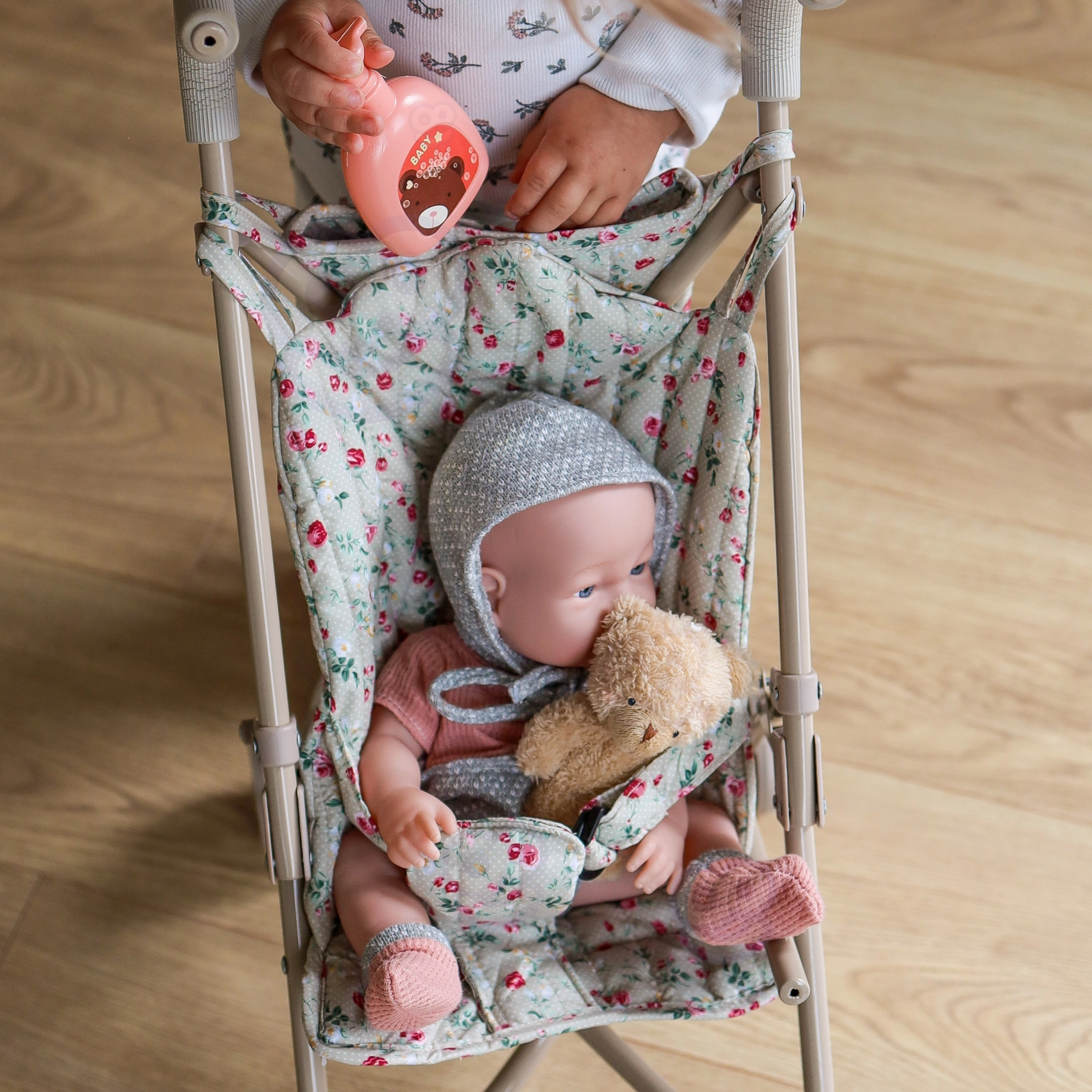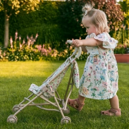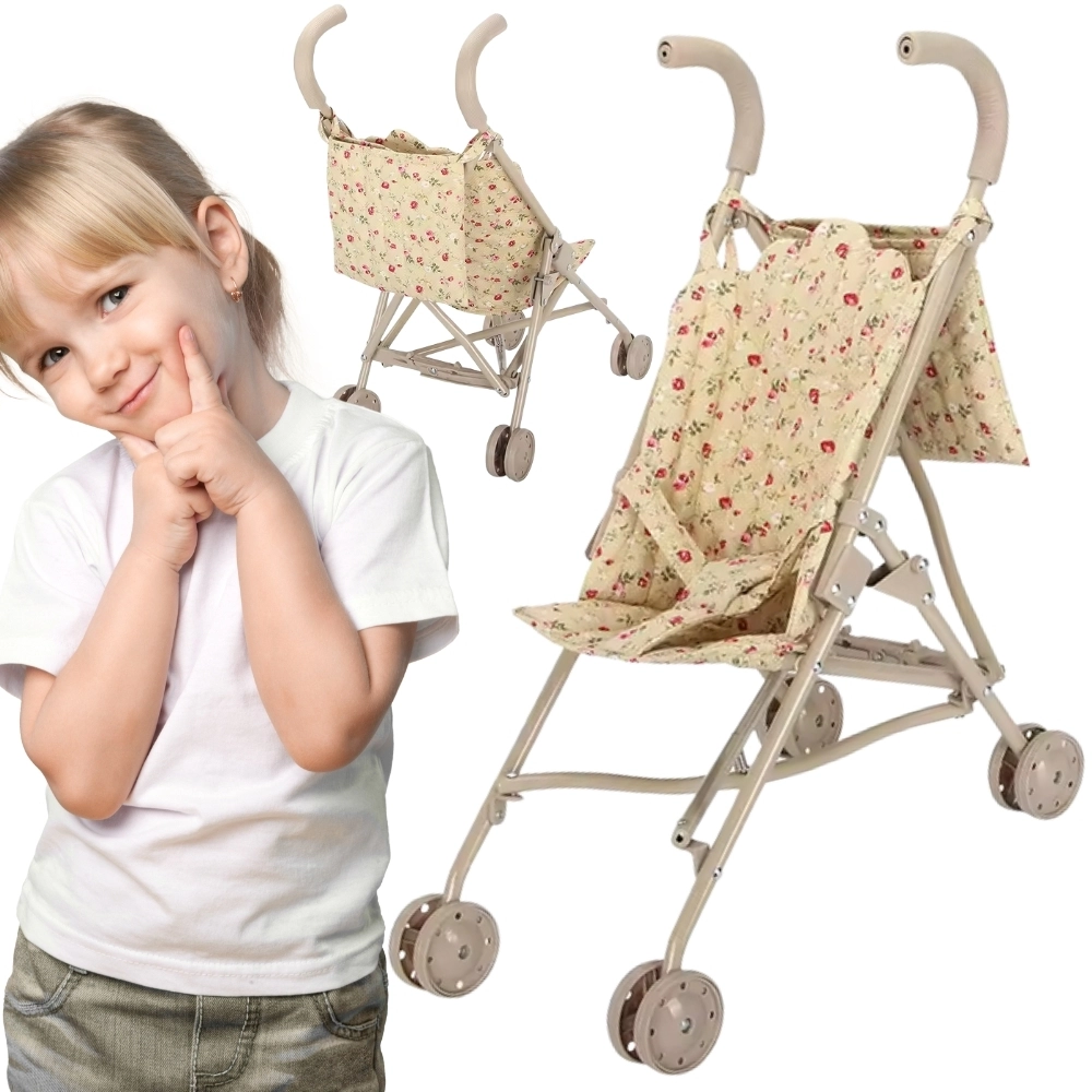 Lille, men gennemtænkt makker til store rollelege som mor og far. Denne dukkebarnevogn i en blid creme nuance med blomstret print kombinerer lethed, stabilitet og hurtig sammenklapning til kompakte mål. Den er nem at bære, passer i bagagerummet eller skabet og er klar til leg på ingen tid.