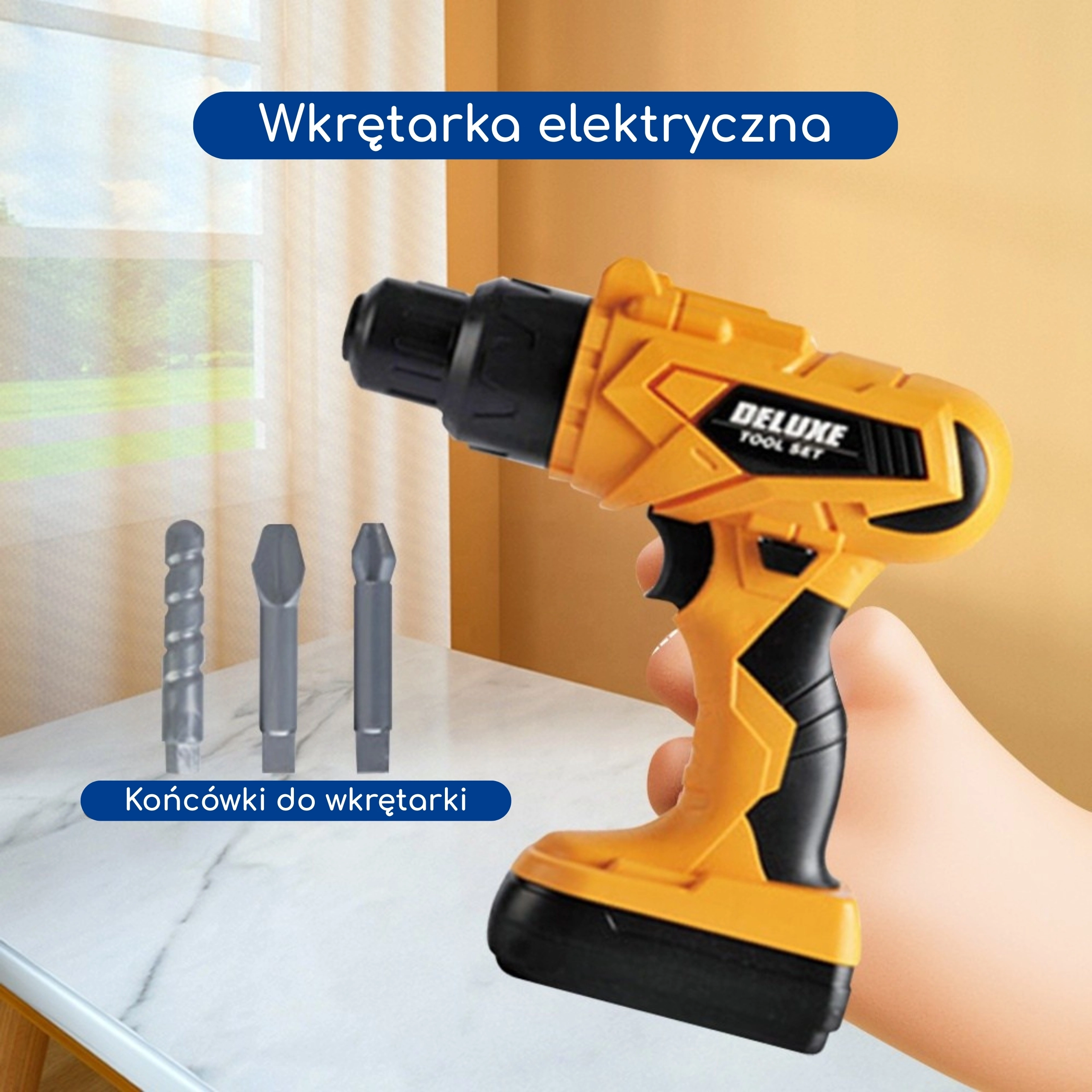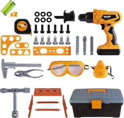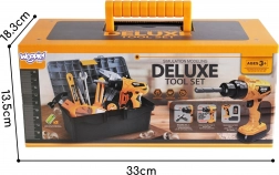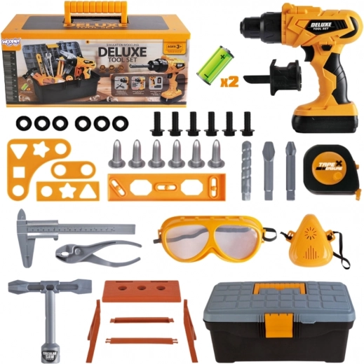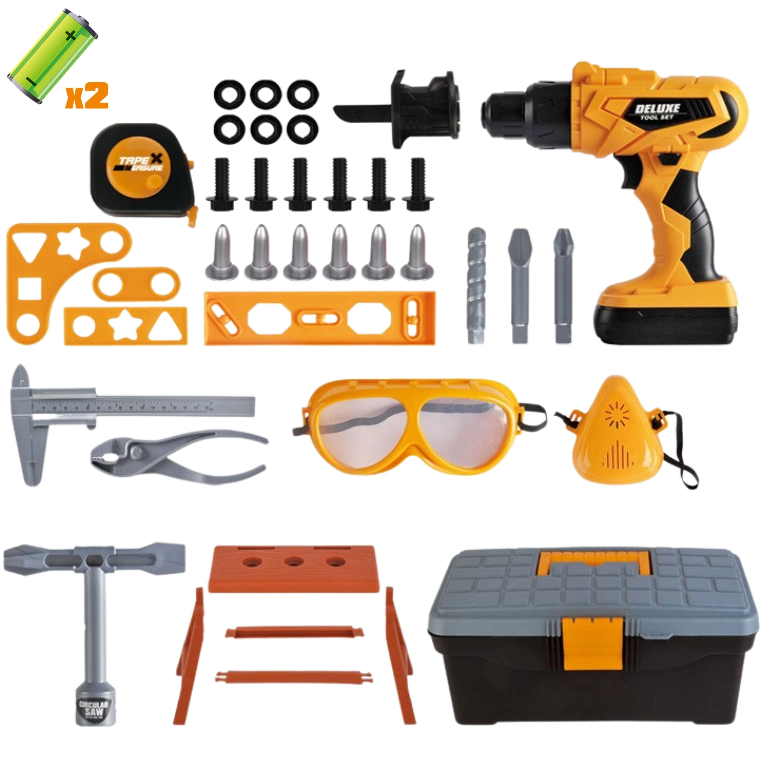 Alt opbevares i en robust kuffert/værktøjskasse, som gør det nemt at transportere og holde styr på delene. Der medfølger også beskyttelsesbriller, skruer, møtrikker, bits, bor, forbindelsesplader, mini-arbejdsbænk og flere værktøjer (nøgle, målebånd, tang). Legetøjet er designet til børn fra 3 år og udvikler manuelle færdigheder, kreativitet, fantasi og øje-hånd-koordination.