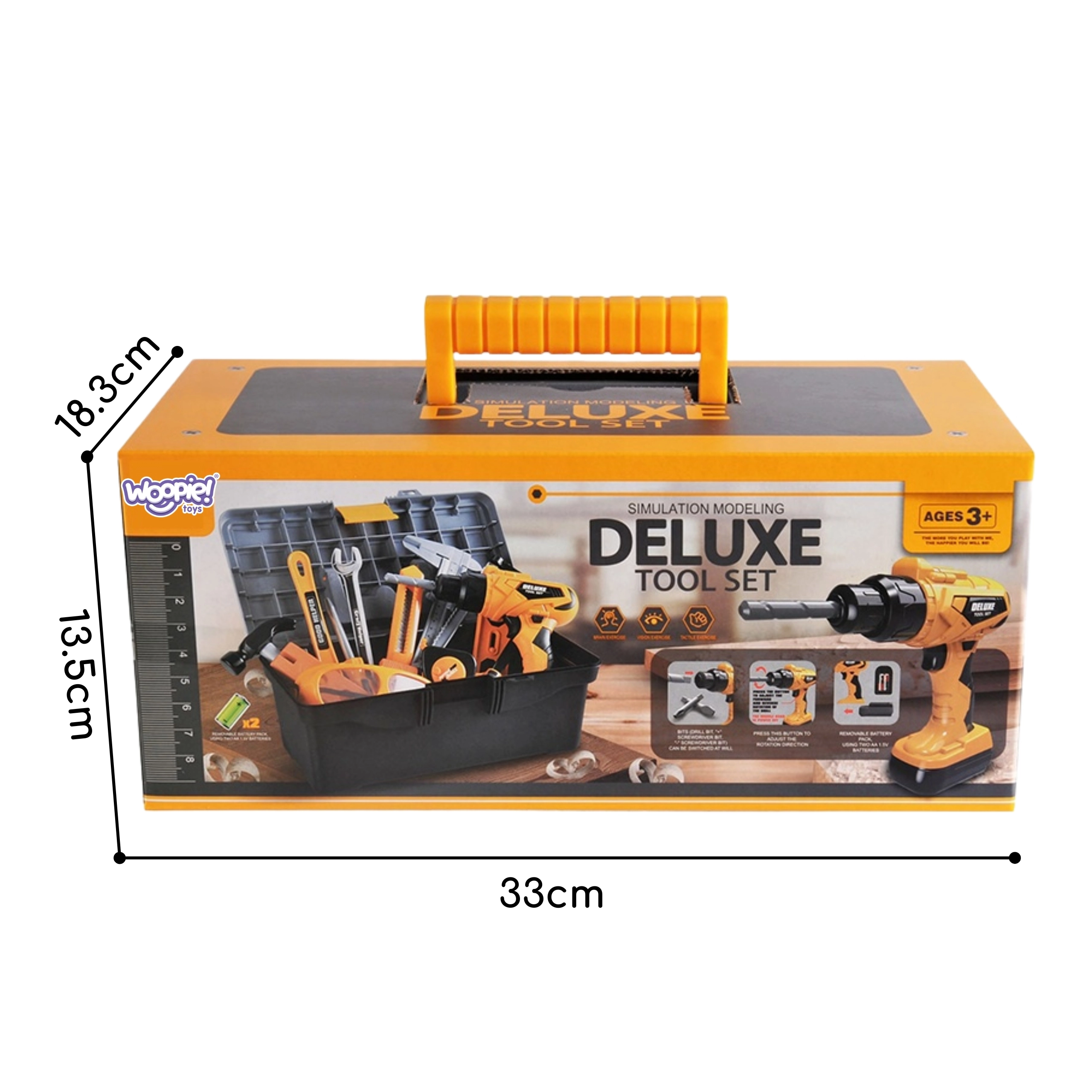 Værktøjssættet til den lille gør-det-selv’er Woopie forvandler ethvert værelse til et mini-værksted. Børn kan efterligne de voksne, skrue, bore og samle ved hjælp af det omfattende tilbehør. Den elektriske akku-boremaskine med retningsskifte og udskiftelige tilbehør (inklusive tilbehør af typen “stiksav” og bitholder) giver legen ekstra autenticitet.