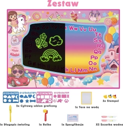 Pakken indeholder: 2-i-1 underlag (ca. 100 × 70 cm), UV-pen, 2× vandtusch, 2× skabelon, rulle, 3× stempel og en absorberende klud.