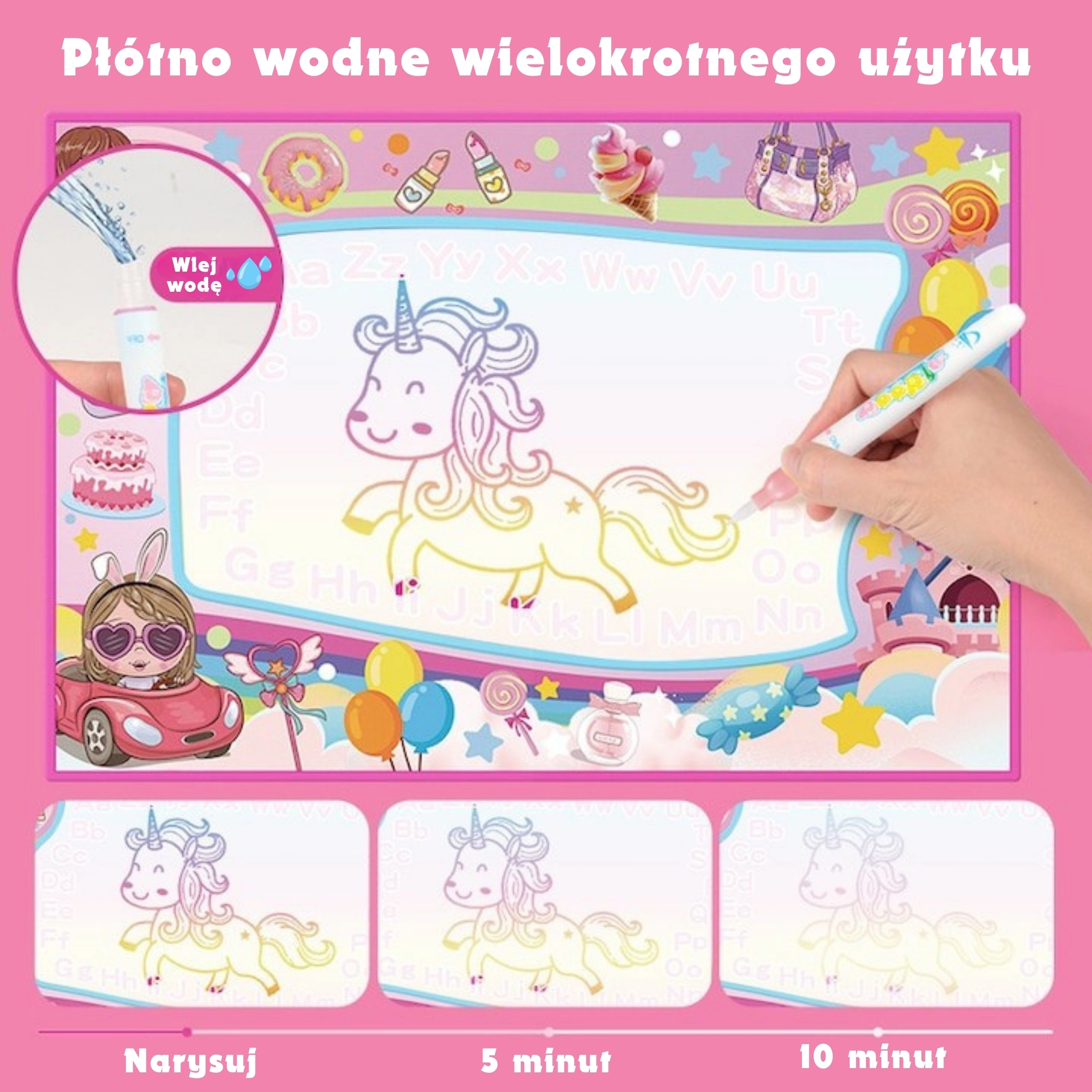 Dette store 2-i-1-underlag lader børn eksperimentere sikkert med farver og lys – uden blæk, uden pletter og uden risiko for at beskadige møbler. Fyld blot tuscherne med vand, eller brug den medfølgende UV-pen, og se, hvordan billederne forsvinder af sig selv efter et øjeblik. Underlaget er let, nemt at opbevare og egner sig både til hjemmet og haven.