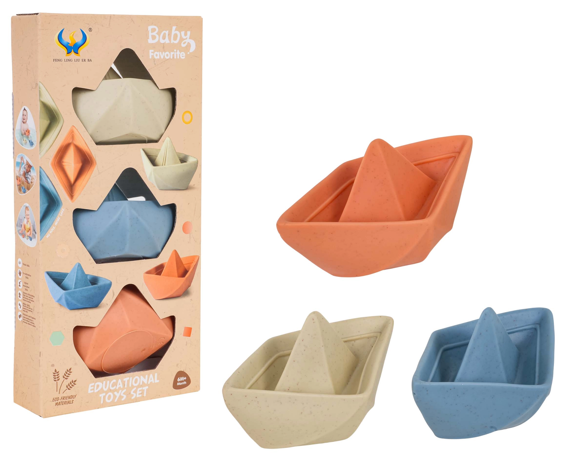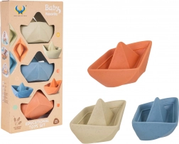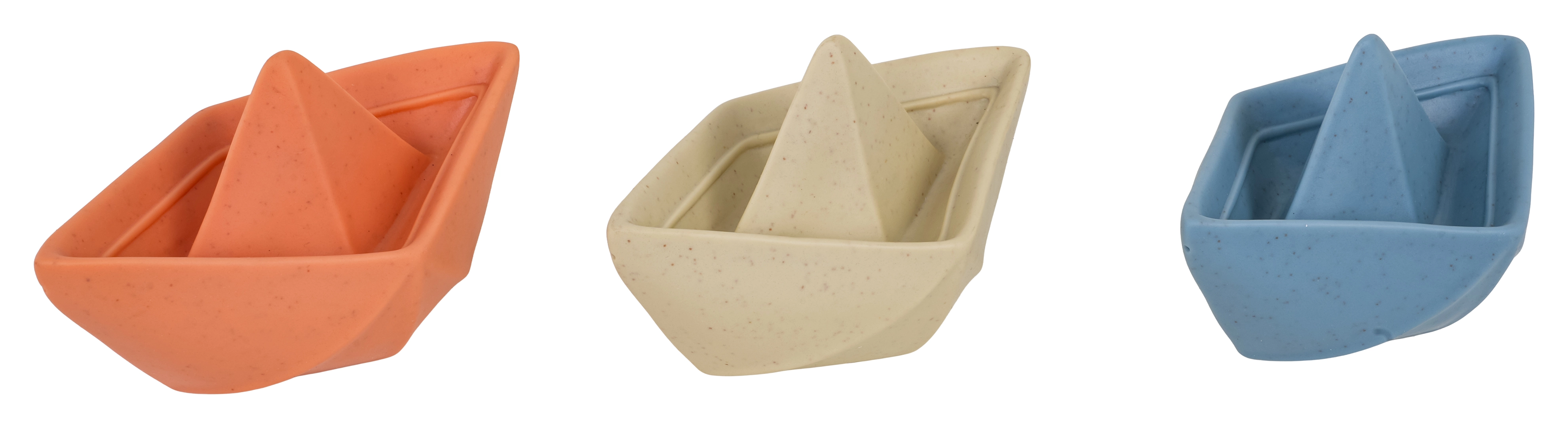 Dette sæt med tre søde både giver masser af sjov under badet og i leg på land. Det holdbare, behagelige materiale uden skadelige stoffer er skånsomt mod børns hud og let at vedligeholde. Takket være den pladsbesparende form kan bådene nemt stables og ryddes væk.