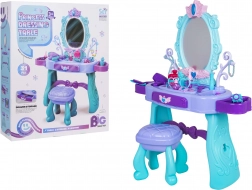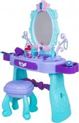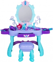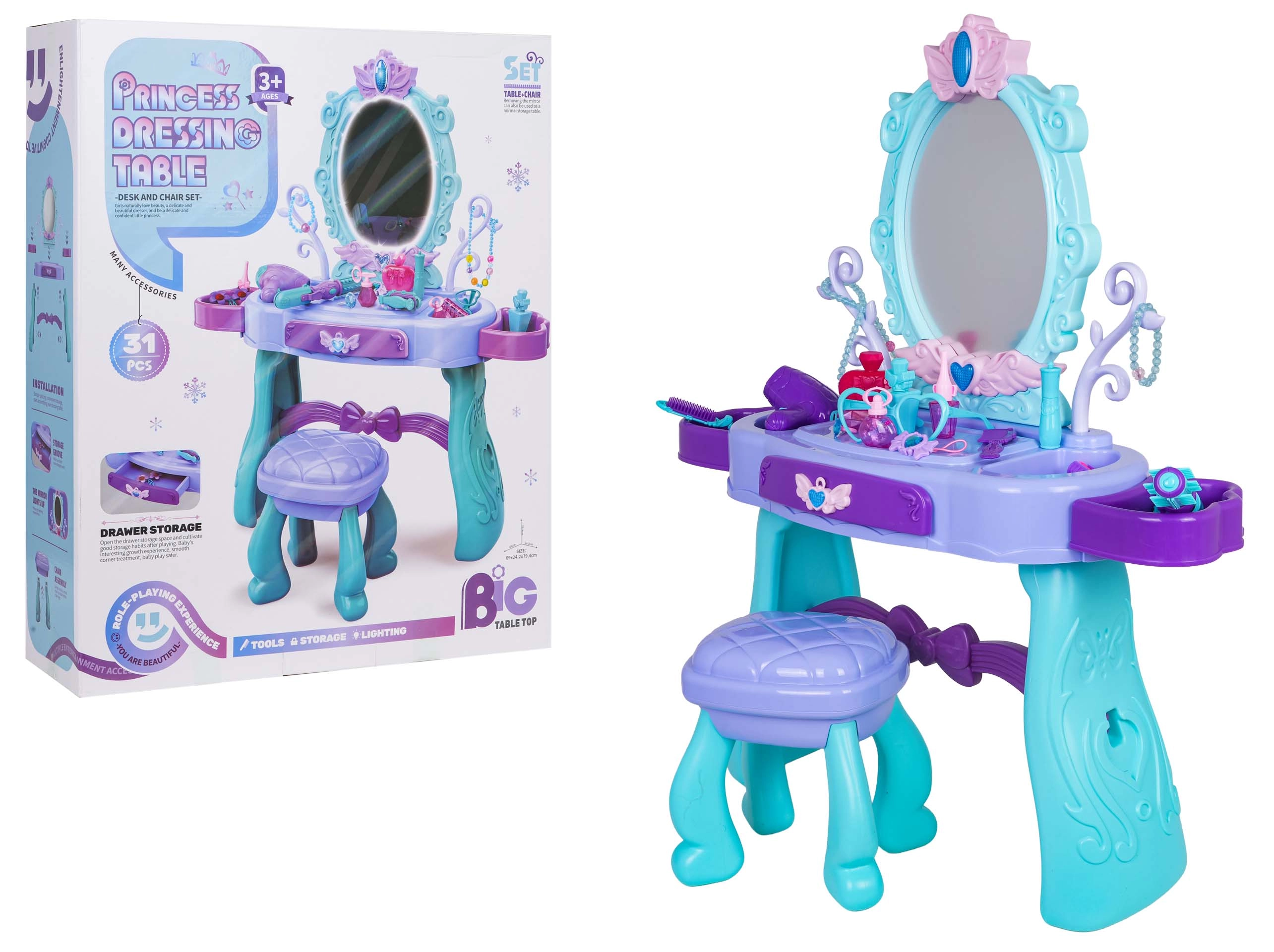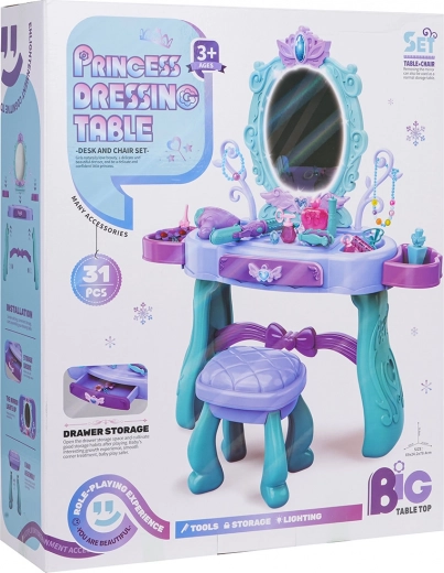 Stilfuldt børnesminkebord med stort spejl, baggrundsbelysning og et rigt sæt tilbehør til kreativ leg. Indeholder skammel, skuffe og sidehylder til tilbehør. I pakken finder du hårtørrer, krøllejern med glattejern, kamme, briller, smykker og make-up tilbehør. Til spejlets lys skal der bruges 2× AA-batterier (medfølger ikke). Ideel gave til små prinsesser fra 3 år.