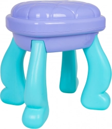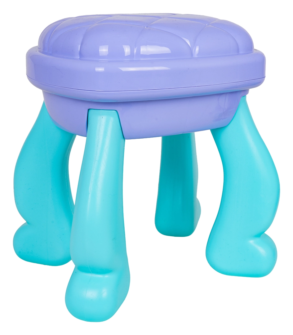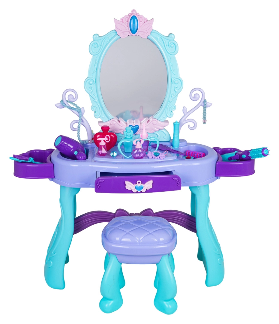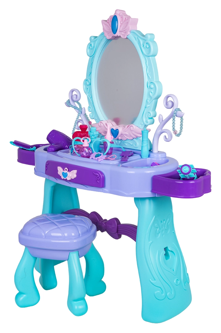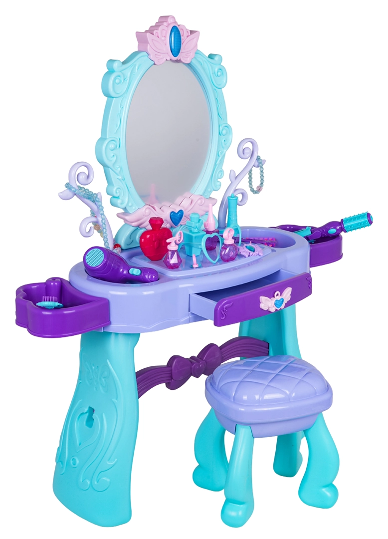 Forkæl børnene med deres egen magiske skønhedskrog. Dette sminkebord i turkis og lilla byder på et stort ovalt spejl med belysning, en praktisk skuffe og sideaflægningsflader til alt tilbehør. Den stabile skammel sikrer behagelig siddestilling og sikker leg.