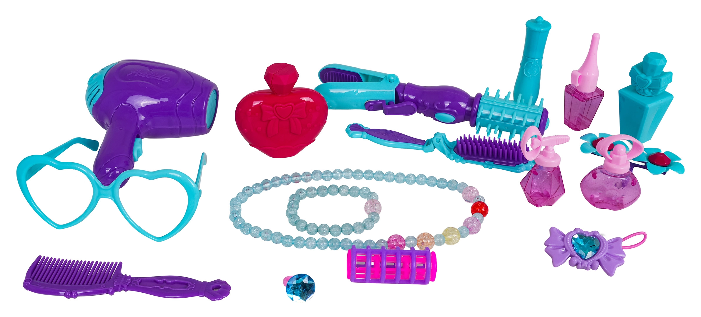 Det rige tilbehørssæt understøtter fantasien og rolleleg som frisør eller makeupartist. Børn kan “føne”, “krølle”, rede håret, pynte sig med smykker og organisere deres skatte i de medfølgende beholdere. Spejlet lyser, når der indsættes 2× AA 1,5 V batterier (medfølger ikke).