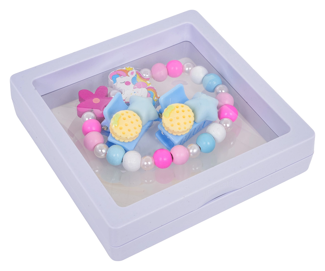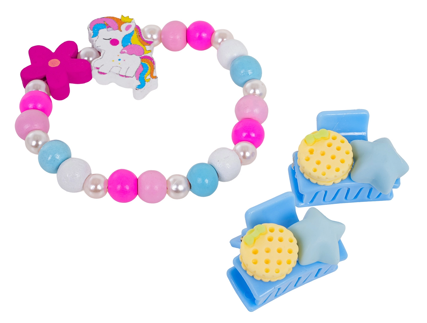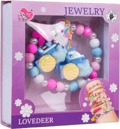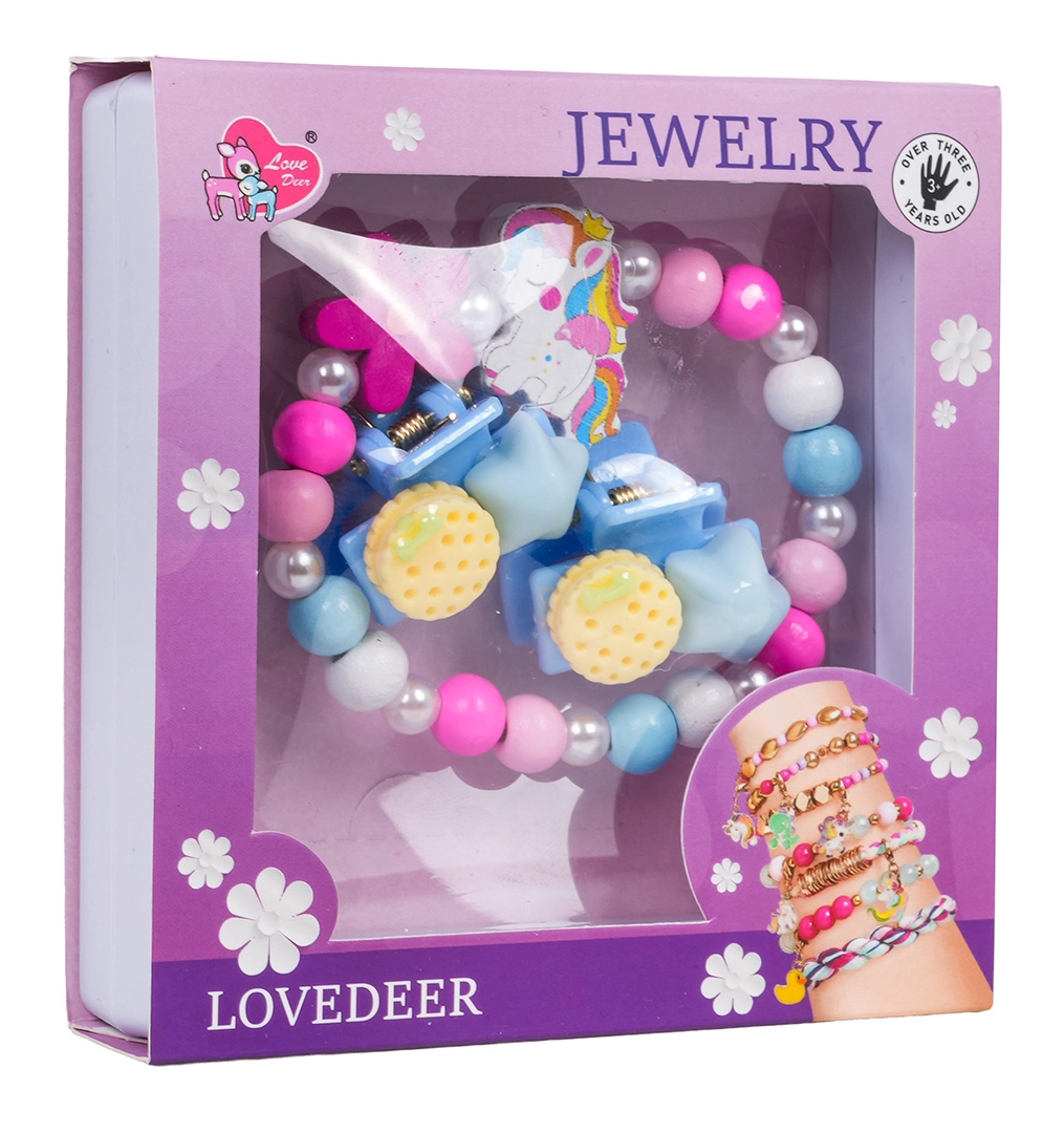 Opdag et legende smykkesæt med enhjørning, der kombinerer farverige perler, små perler og matchende hårtilbehør. Det elastiske armbånd er let at tage på, spænderne holder fint om de fine hårtotter, og hele sættet er perfekt til både hverdagspynt og festlige stunder.