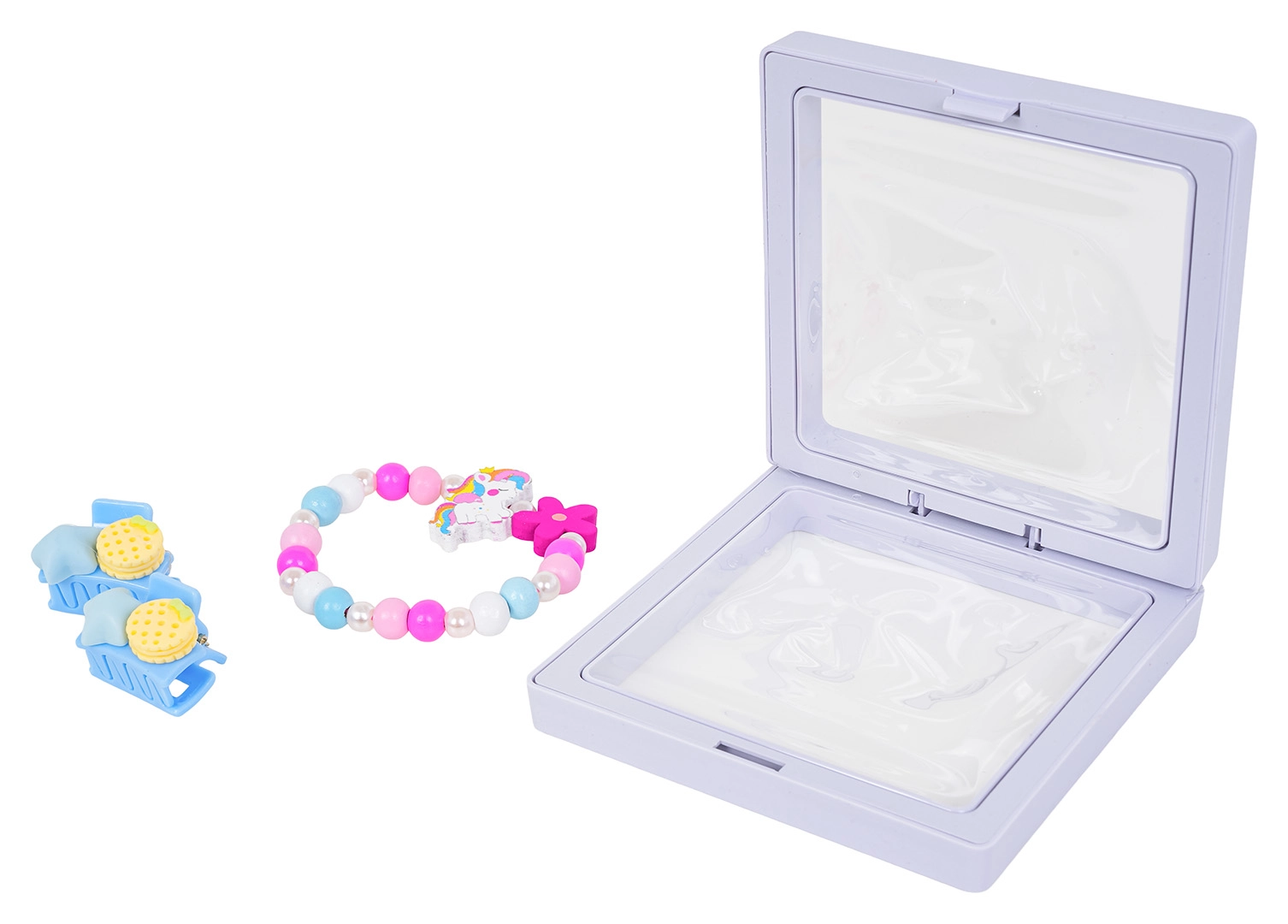 Takket være de kompakte mål passer sættet nemt i en lille rygsæk eller skuffe og er klar til leg hjemme og på farten. Et perfekt valg til små elskere af farver og søde motiver, der vil matche armbånd og hår i én stil.