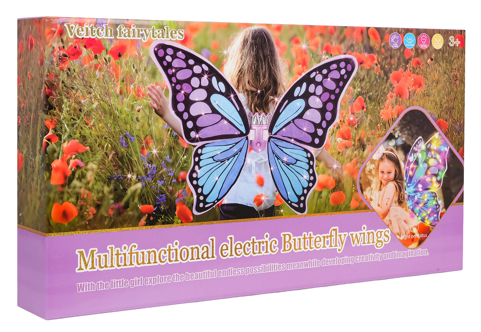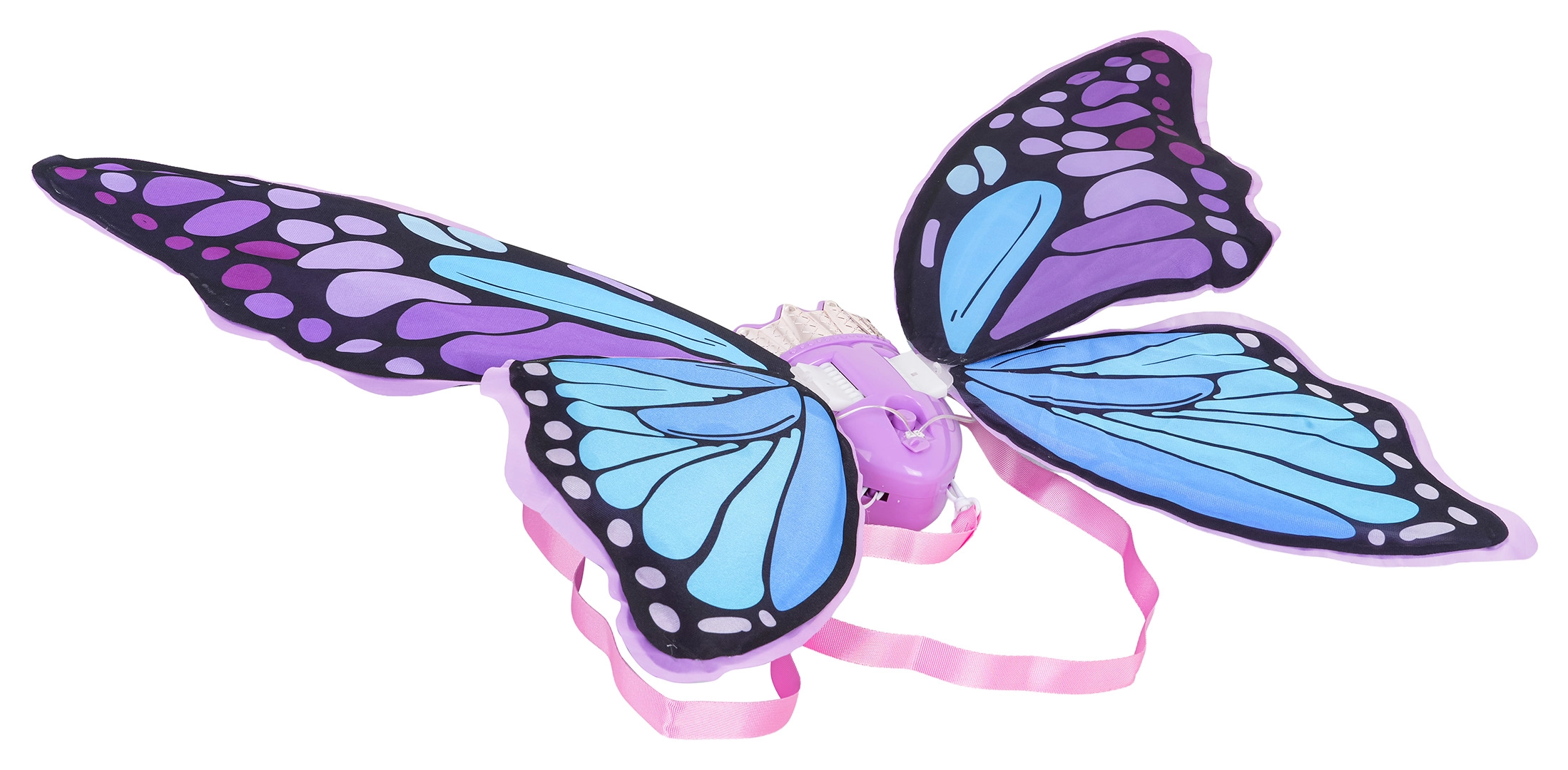 Fortryllende sommerfuglevinger i lilla og blå nuancer lyser enhver børnefest op. Den lette konstruktion og bløde stropper giver komfort, mens de integrerede lyseffekter og melodier stimulerer barnets fantasi.