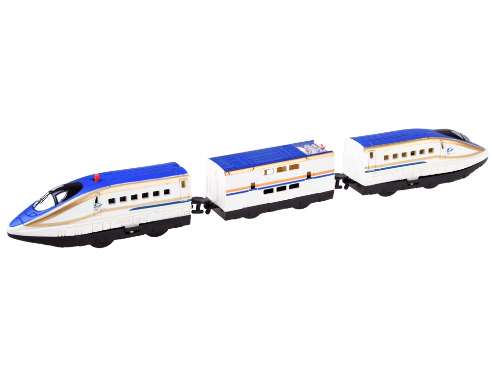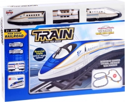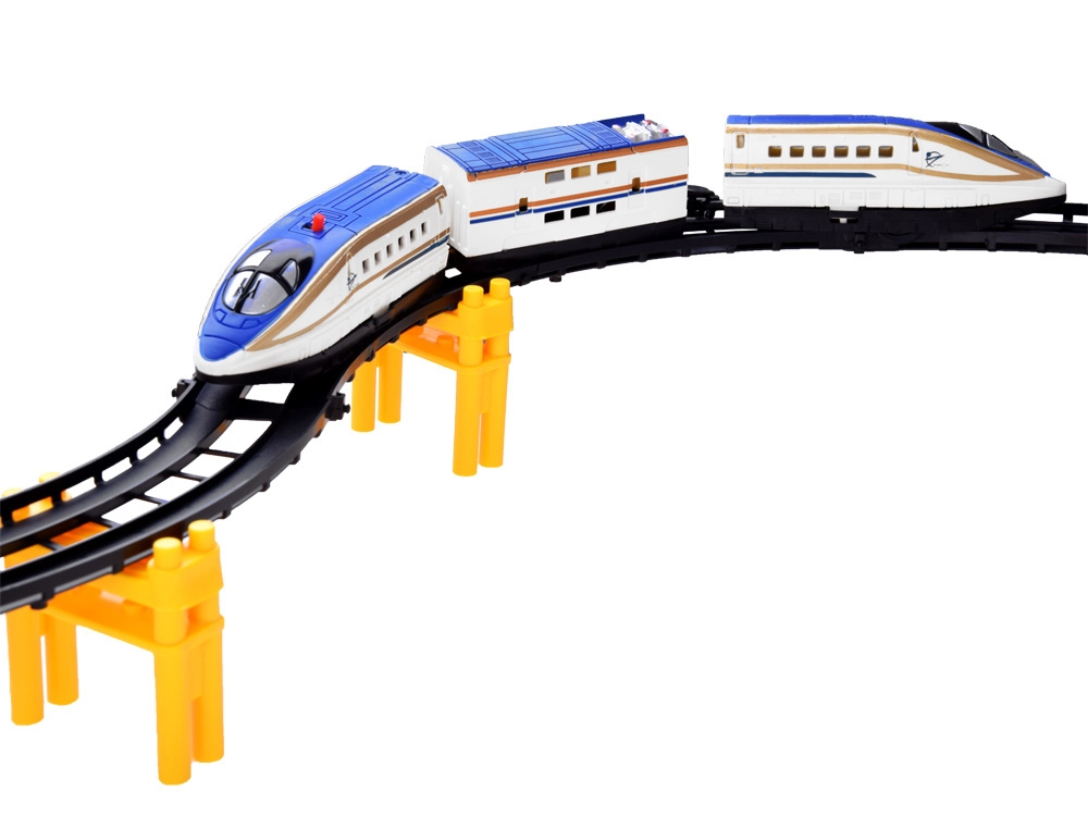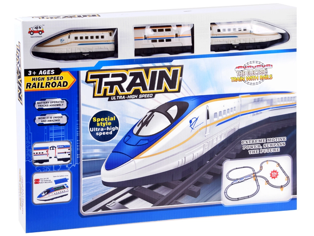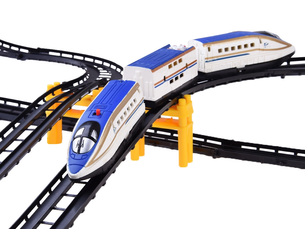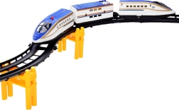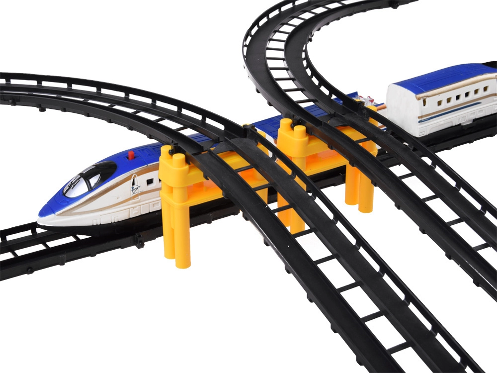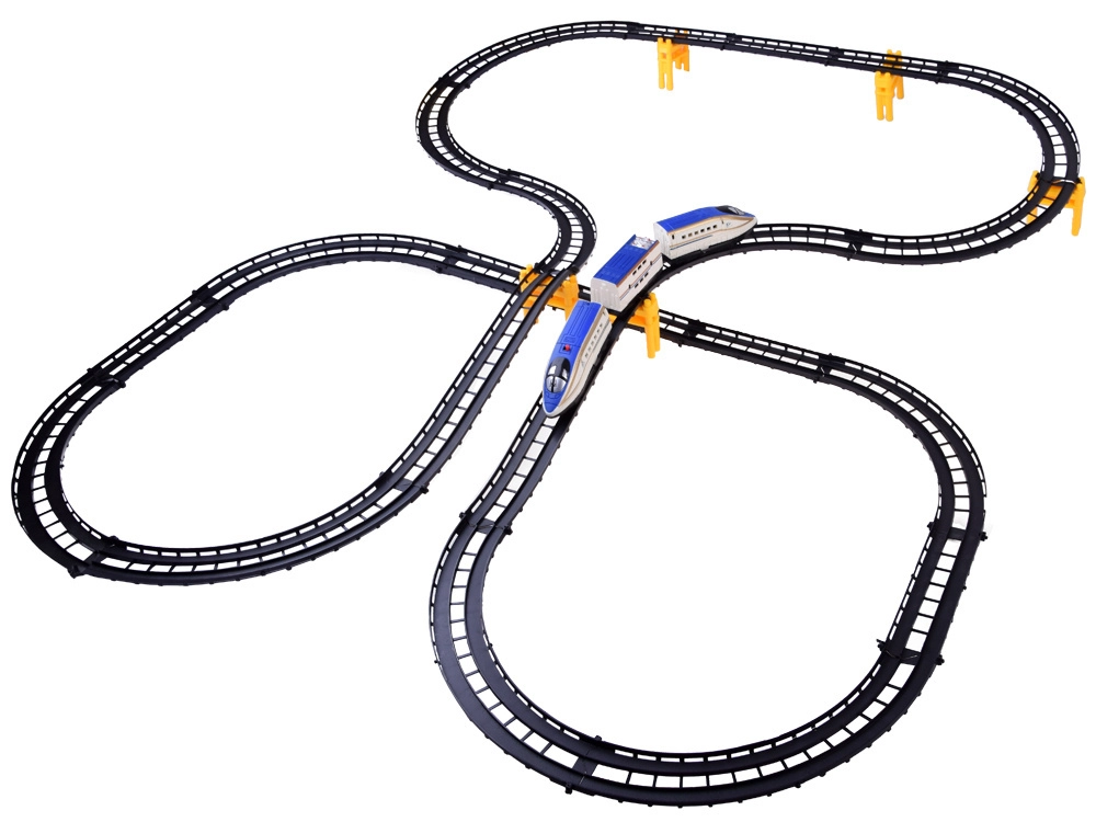 En underholdende elektrisk togbane med et moderne passagertog og forhøjede broer giver børn timevis af kreativ leg. Toget består af et lokomotiv og to vogne, skinnerne er lavet af holdbar plast og gør det muligt at bygge en bane på op til 6,26 m. Takket være det nemme kliksystem er skinnerne stabile og sikre, toget drives af 2× AA-batterier (medfølger ikke) og styres med en simpel ON/OFF-kontakt. Der medfølger viadukter, kurver og stigninger for dynamisk kørsel uden at afspore.