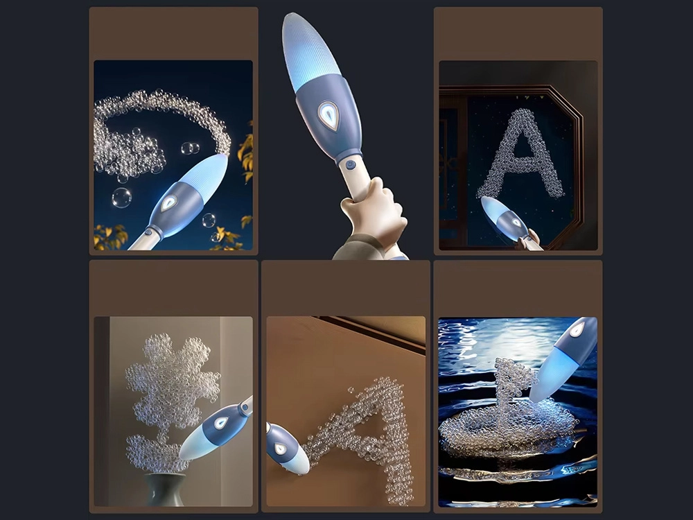 Oplev magien ved kreativ leg med denne elektriske pen, der “skriver” og tegner med sæbebobler. Tryk blot på knappen og nyd en kontinuerlig strøm af bobler uden at puste. Let, ergonomisk design med håndledsstrop, letpåfyldelig beholder til opløsning og genopladeligt batteri sikrer en sikker og sjov aktivitet for både børn og voksne, både inde og ude.