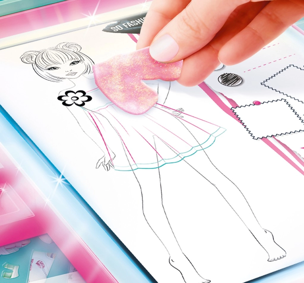 I æsken finder du alt, hvad en lille modedesigner behøver: modeller til optegning, skabeloner, trykte ark og ruller, selvklæbende stoffer, farveblyanter, tusch og sten med klister til den perfekte finish. Indsæt blot 3× AAA-batterier og begynd at skabe.