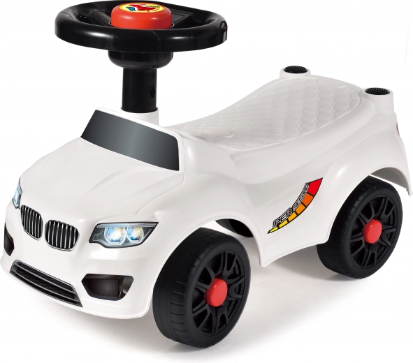 Let og stabil hvid skubbecykel uden ryglæn til de mindste. Den byder på nem betjening, solid konstruktion og kompakte mål 50 × 21,5 × 33 cm – ideel både indenfor og udendørs.