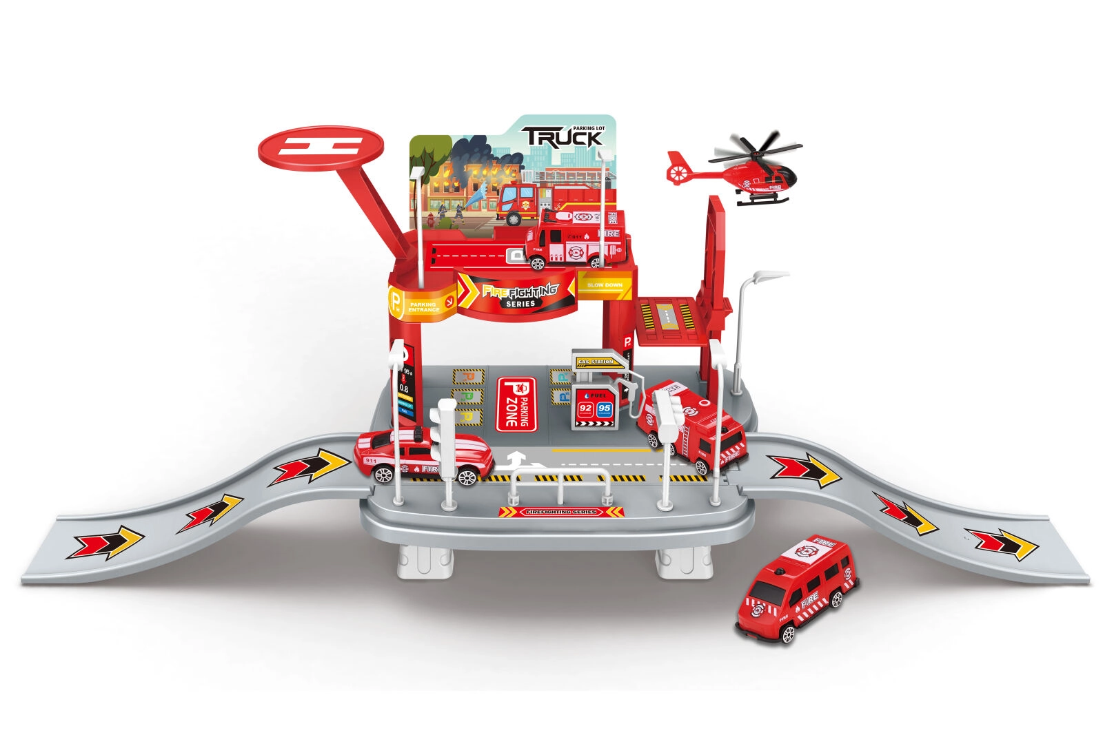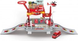 Denne detaljerede brandstation giver børn realistisk redningsleg. Sættet omfatter en komplet park med heliport, manuel elevator til at flytte køretøjer mellem etagerne og en tankstation til at fylde brændstof. Med de medfølgende skilte kan børnene nemt skabe deres egne trafikscenarier.
