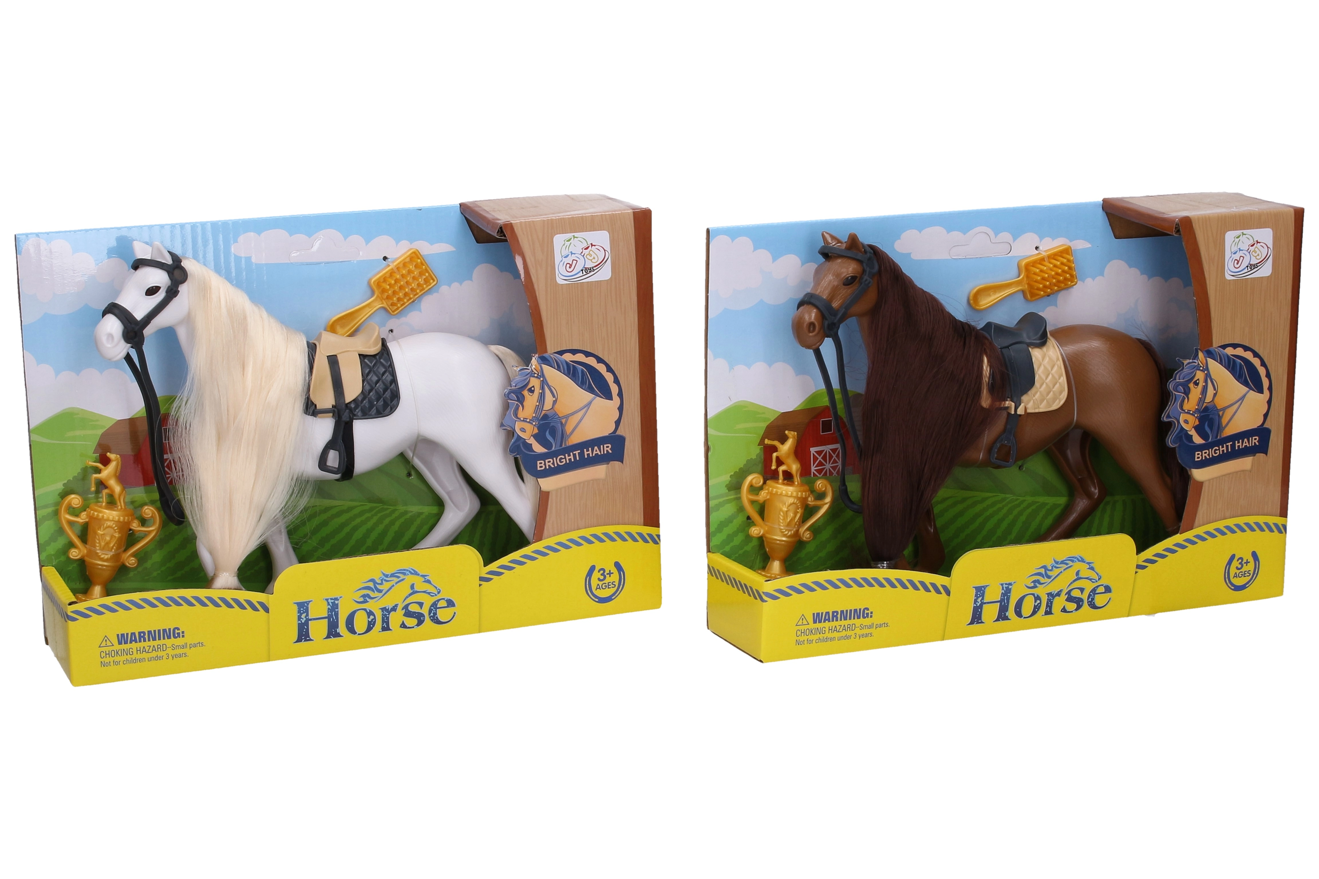 En realistisk hest på 19 cm i to farver (brun og hvid) vil glæde enhver lille hesteelsker. Sættet indeholder en hest med sadel og trense, en trofæ og en børste til pleje af manen – ideel til leg med rideklub og udvikling af fantasien.